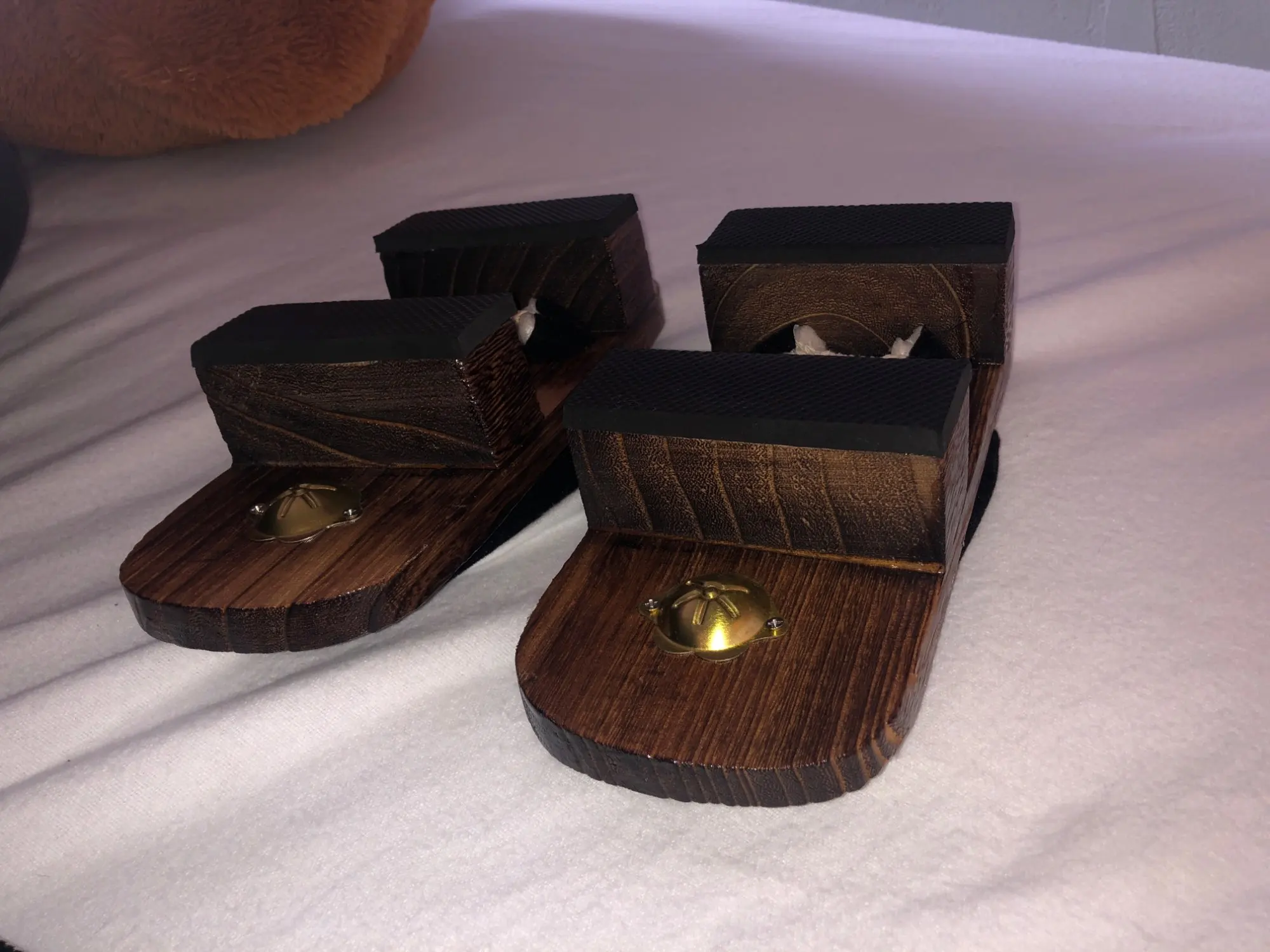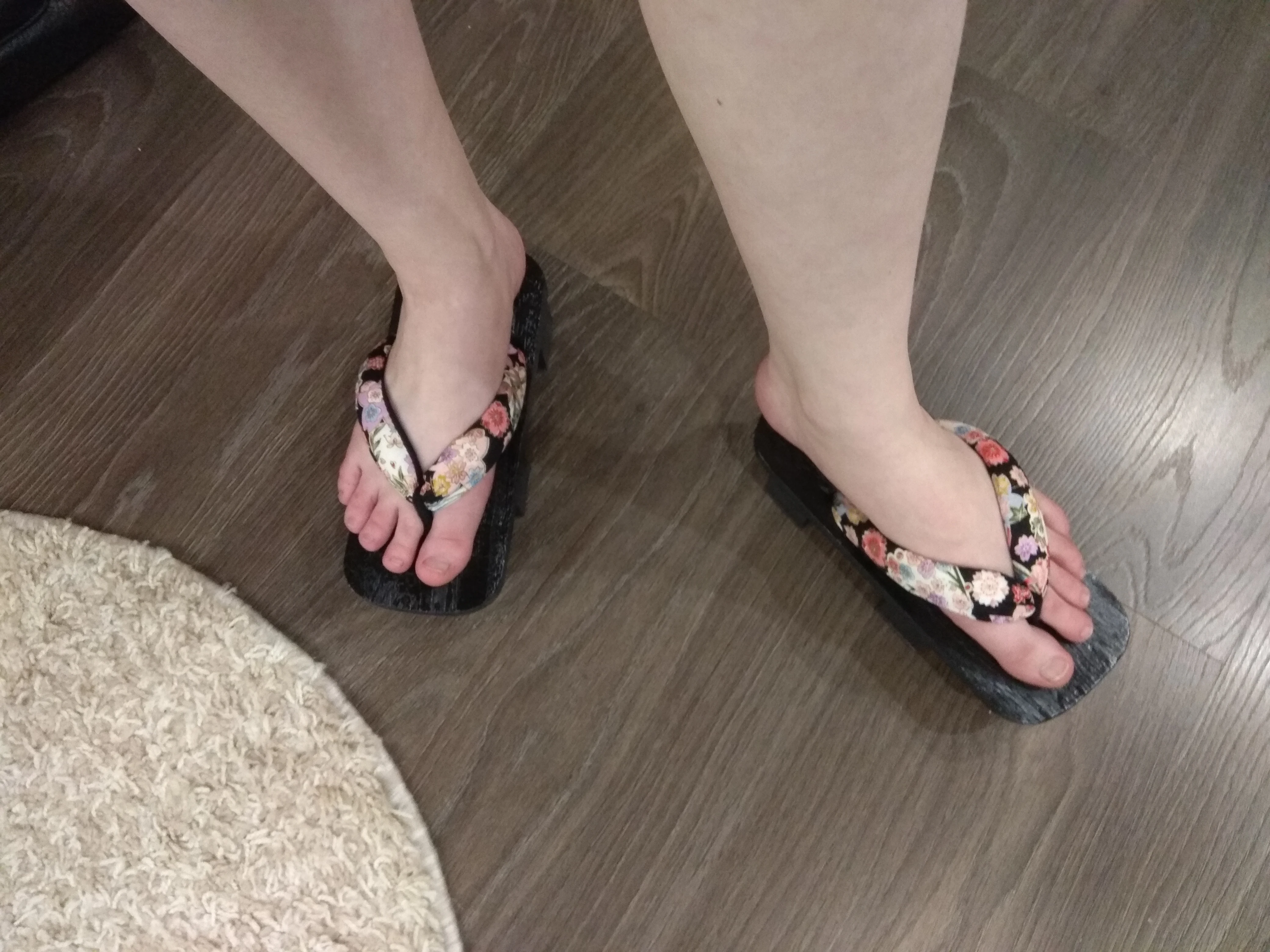 Размер моей ноги 37-38, я взяла 40. Дощечка все равно оказалась короткой для моей ноги, пятка немного торчит. Поэтому рекомендую брать больше на 3-4 размера. Мои ноги сидят в гэта чуть-чуть криво, возможно, это из-за плоскостопия. А так гэта очень красивые и качественные, на полочках прикреплена специальная резиновая прослойка. Плюс в посылке есть белые носки.