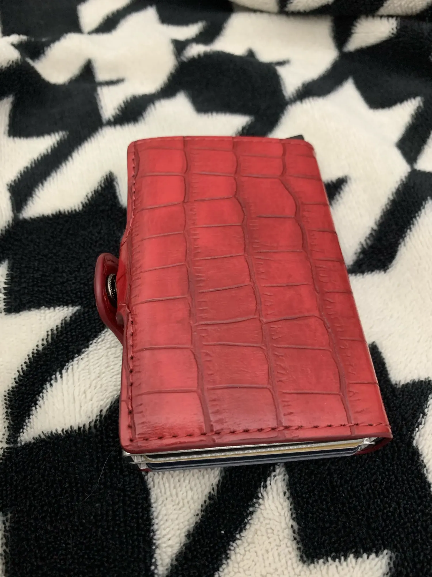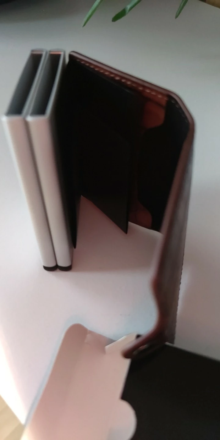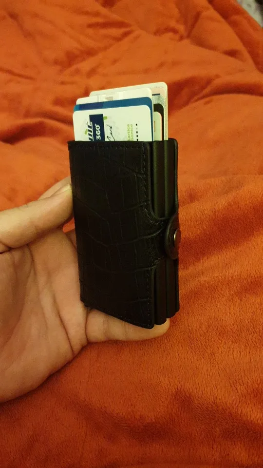 Кошелек был доставлен в течение 14 дней после заказа. Качество является приемлемым. Сам держатель карт, кажется, хорошего качества. Держатель карт покрыт кожаной подкладкой, которая имеет двустороннюю ленту, установленную на держателе для карт. Кожаная подкладка закрыта защелкивающимся соединением, которое является хрупким, я надеюсь, что эта часть кошелька прослужит. Было указано, что я доволен своей покупкой и рекомендую этот продукт и его продавца.