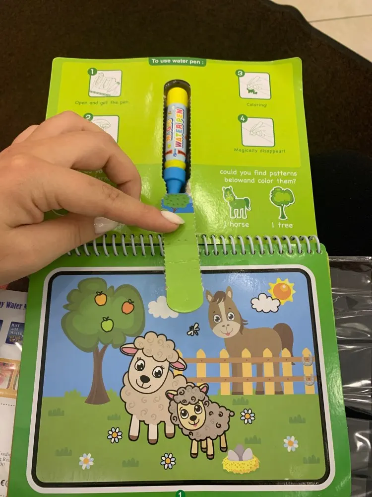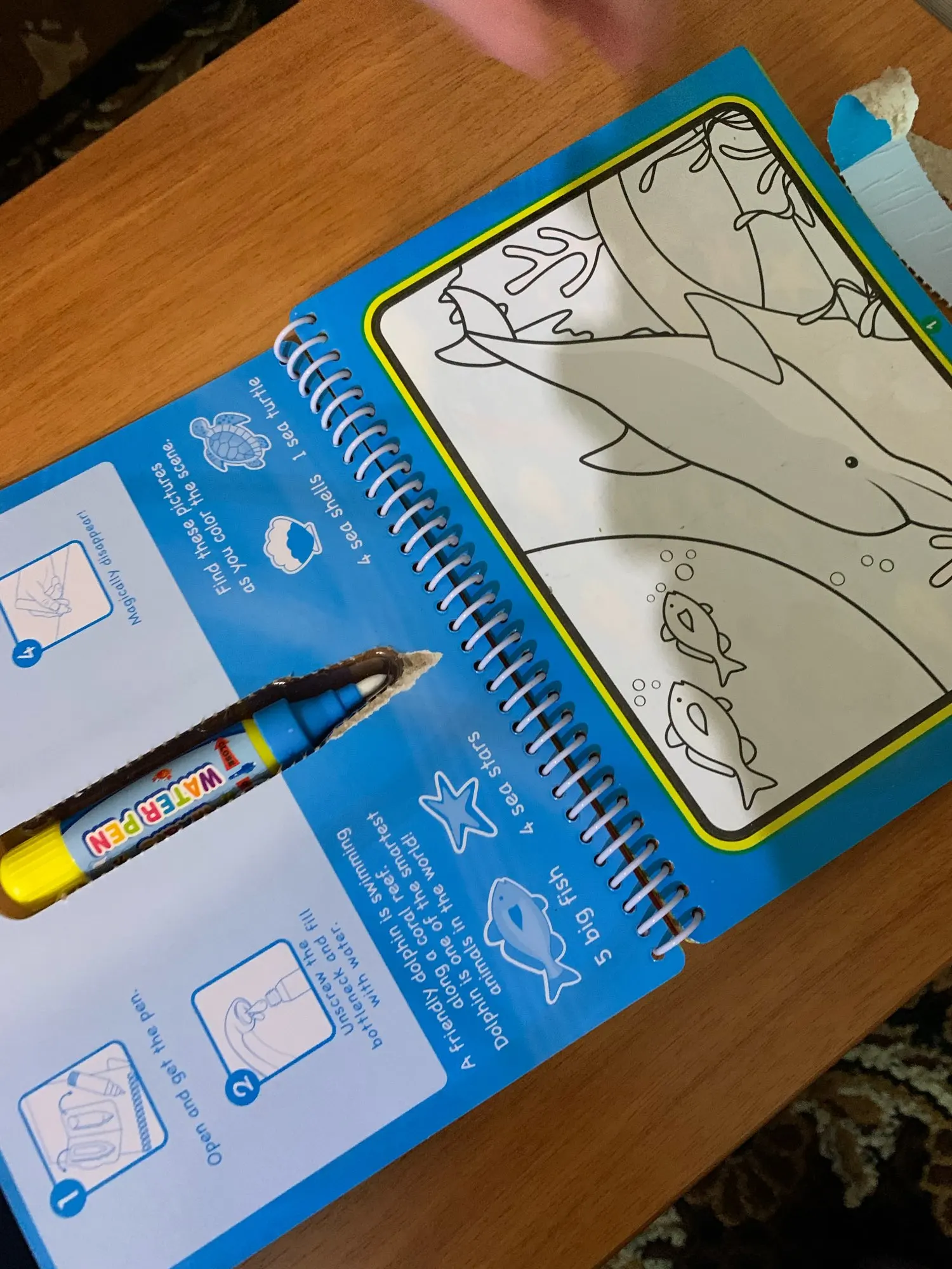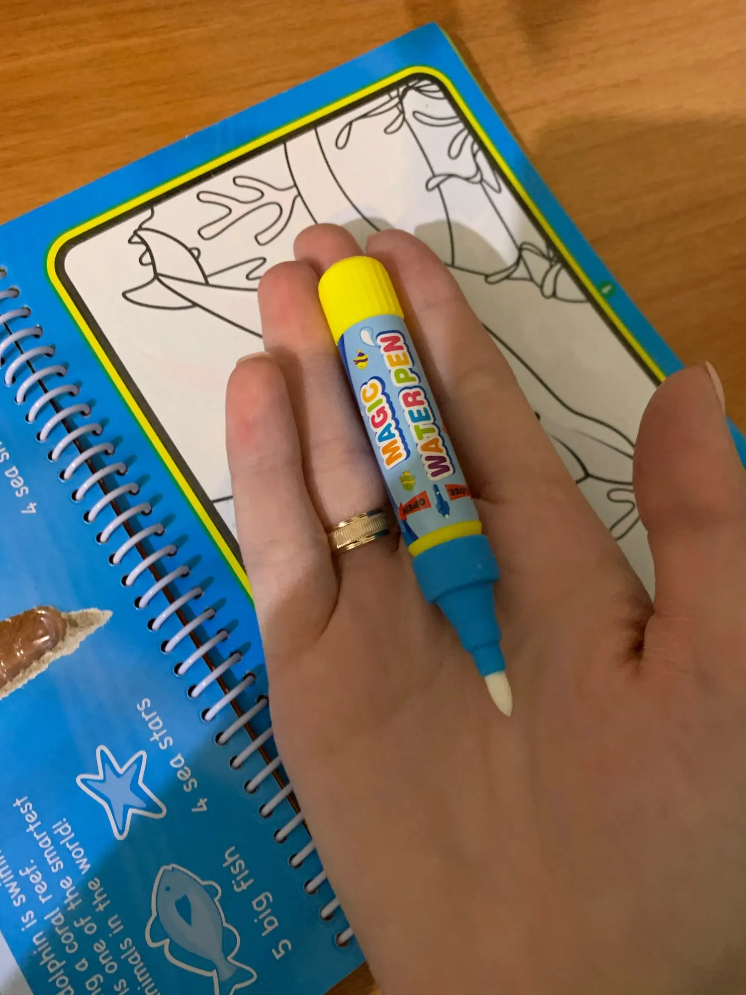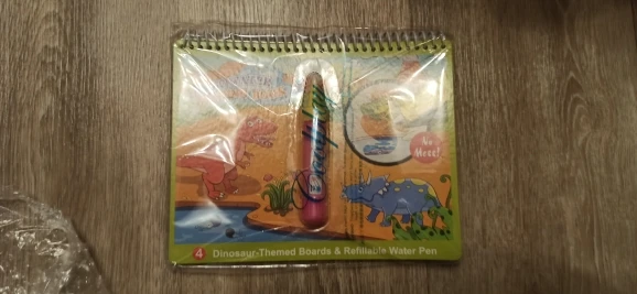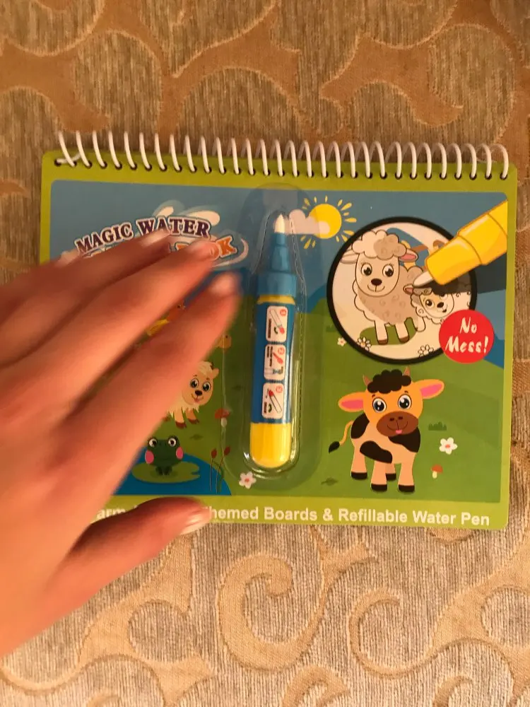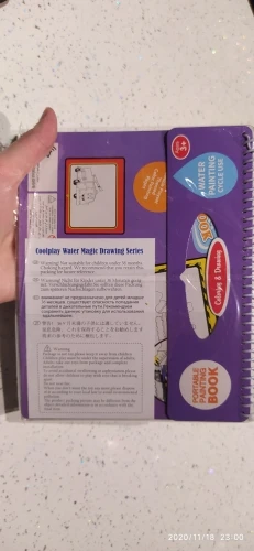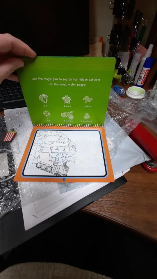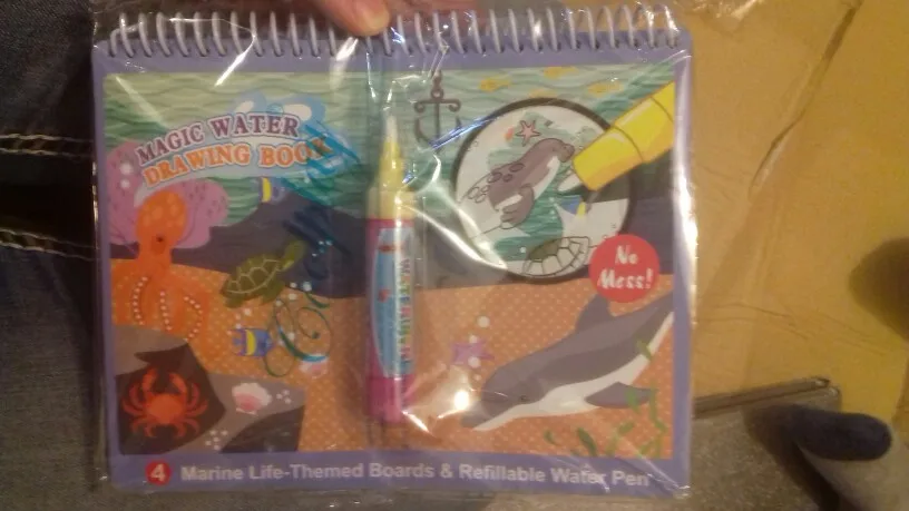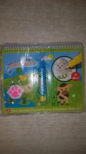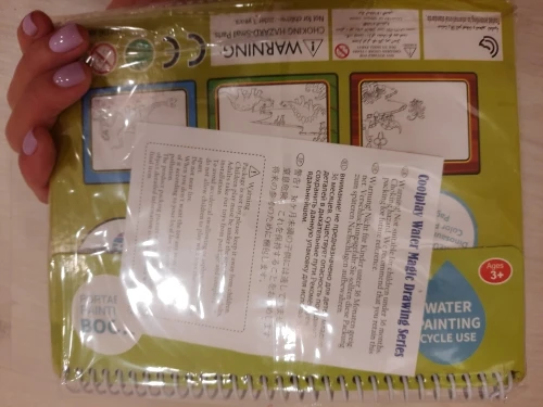 Пришло очень быстро в комплекте с другими посылками. ребенку понравилось разукрашивать картинки. Для того чтобы разукрашивать надо залить водой фломастер. После разукрашивания примерно через час всё высыхает и изображение пропадает и можно снова разукрашивать.)