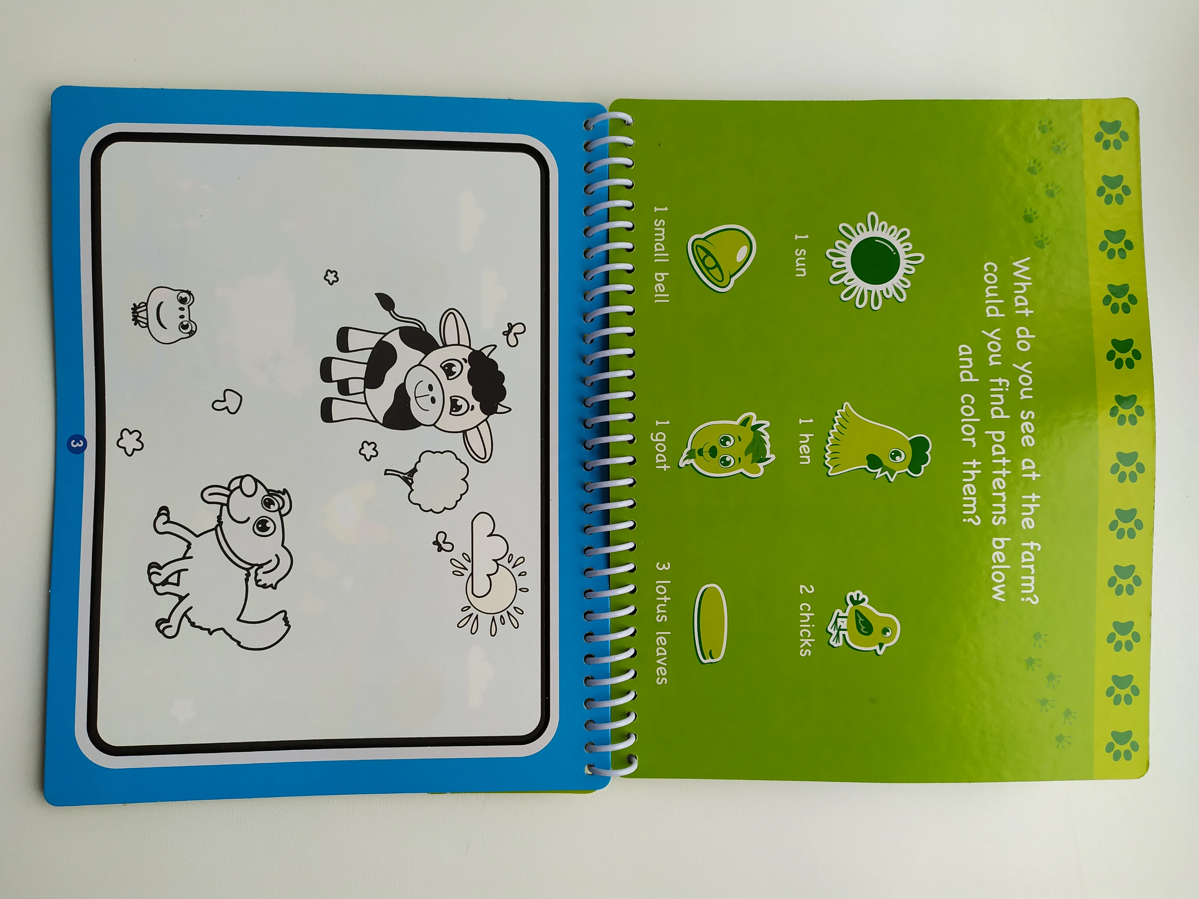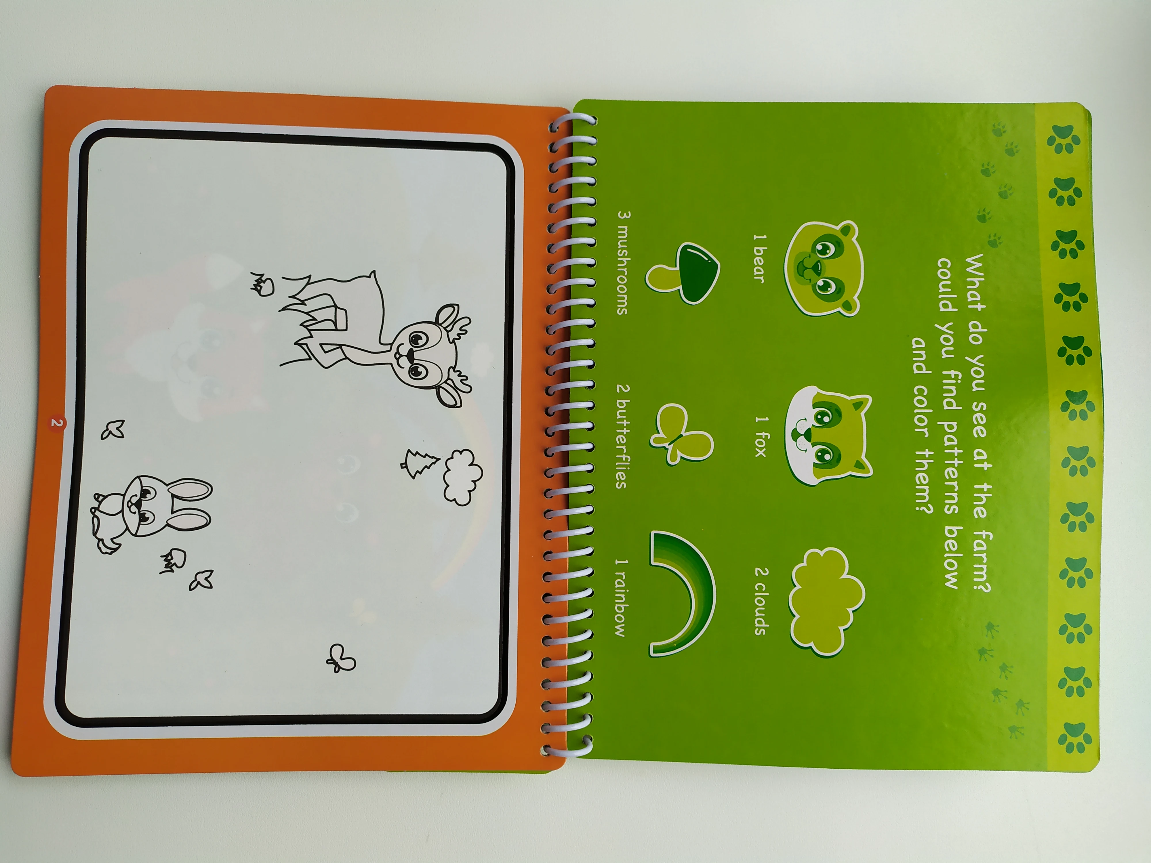 плотная раскраска, можно брать с собой! дочери понравилось. главное правильно показать начало. объяснить про контур в рисовании, про цвета и считать можно мышек, птичек, машины... и необычно! водишь водяной ручкой, а там рисунок проявляется. Ребенку очень понравилось!