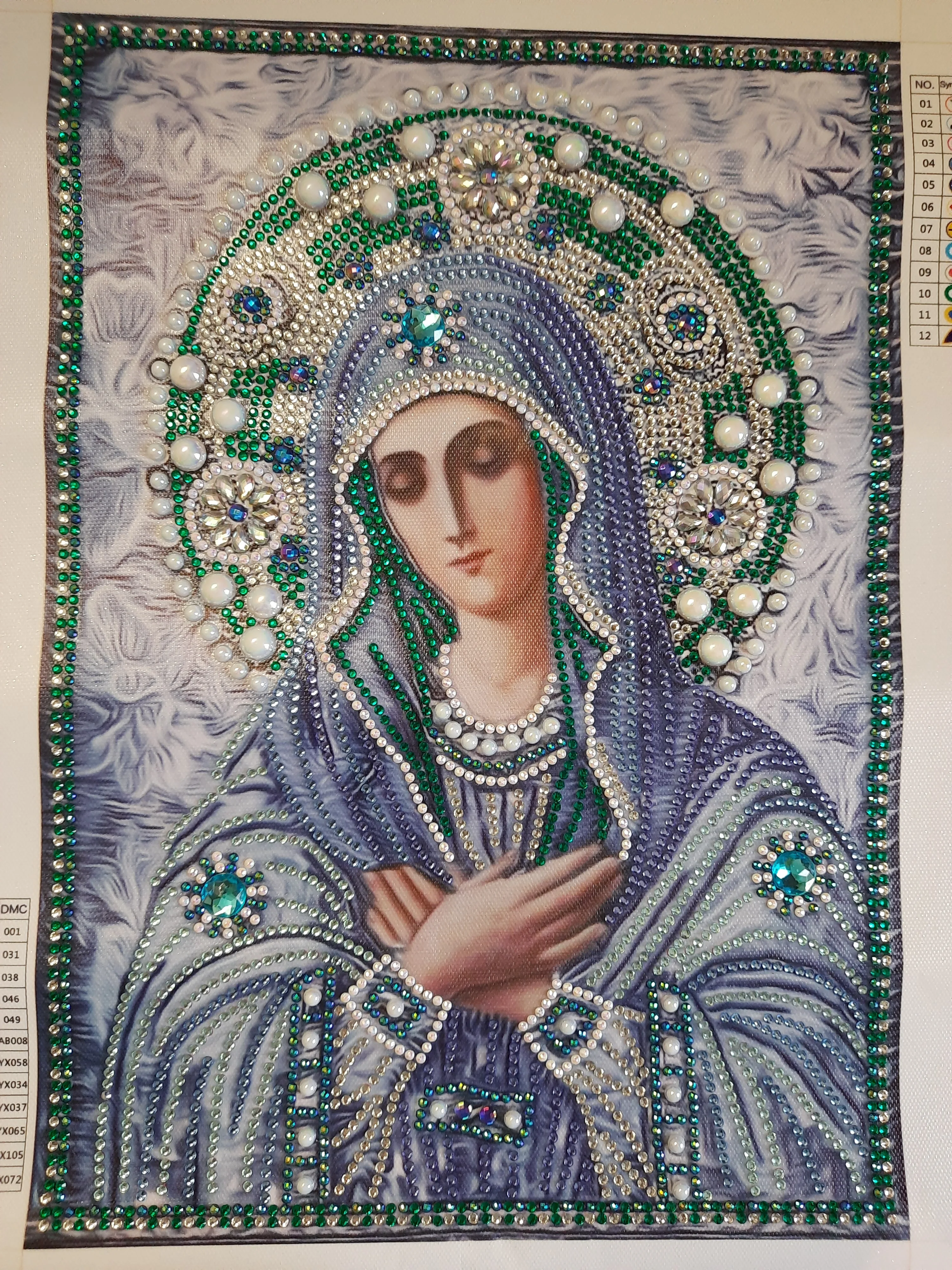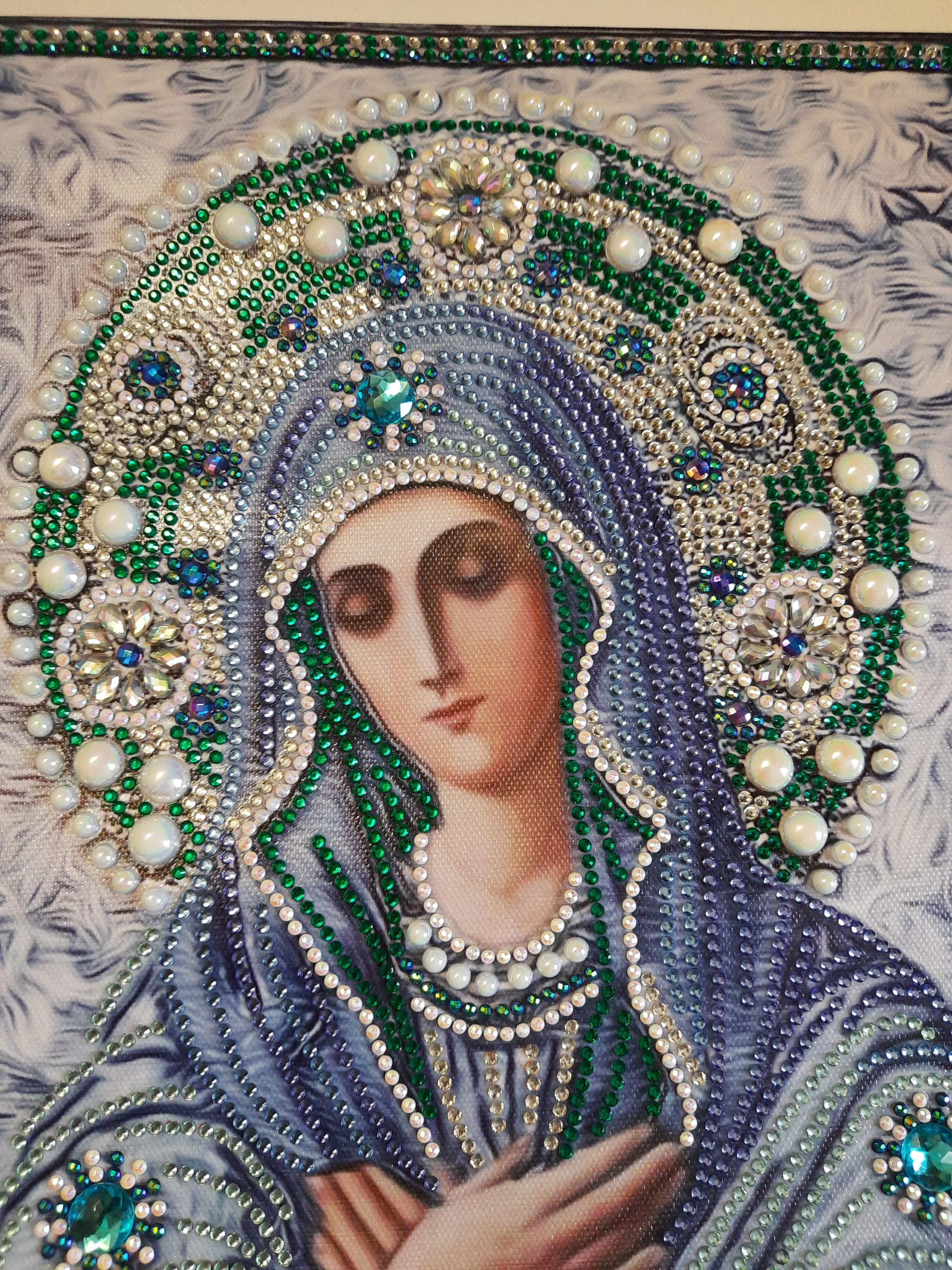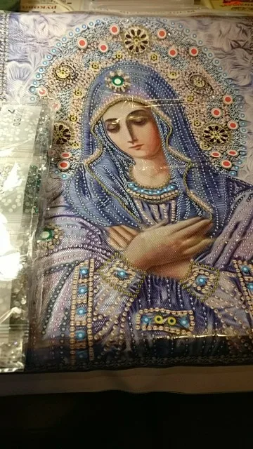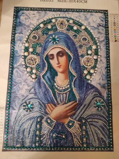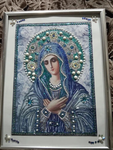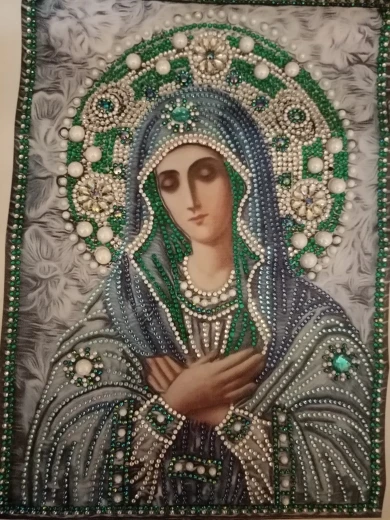 икона красивая. есть большие стразы. пришла сильно помятой. надеюсь разгладится. доставка два месяца. спасибо. рекомендую.