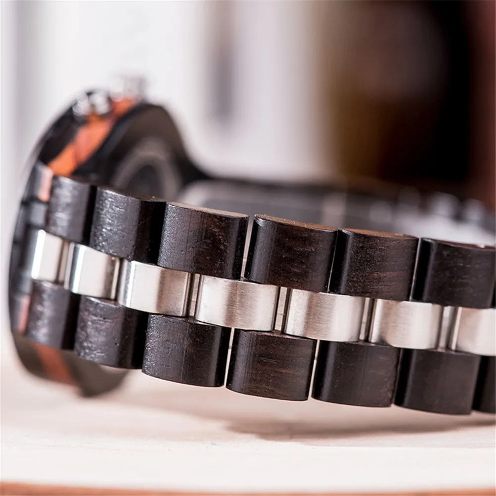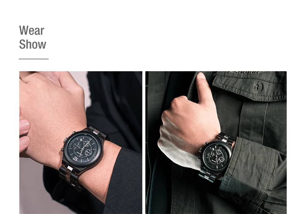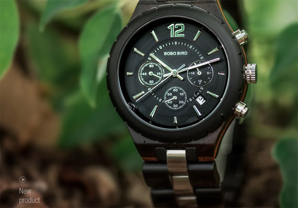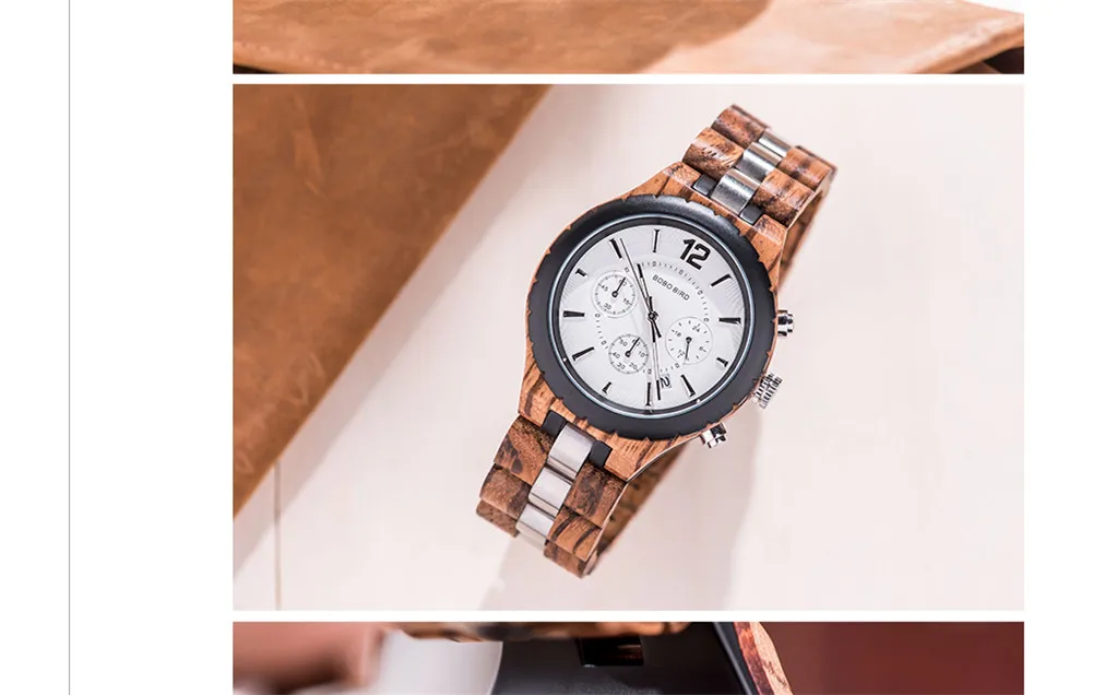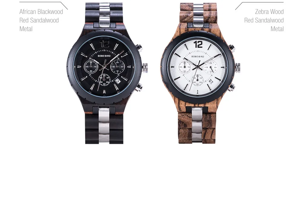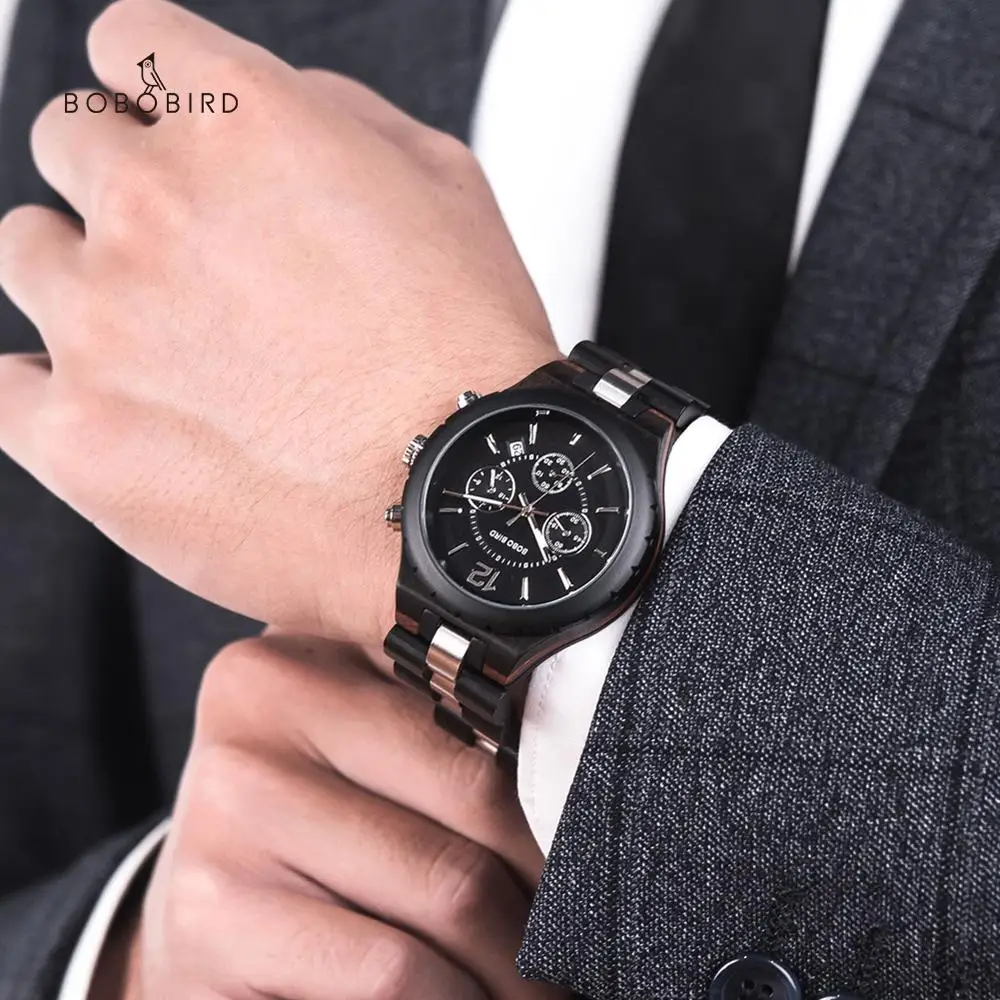 Мужские часы BOBO BIRD с деревянным ремешком, мужские деловые наручные часы с хронографом, часы с браслетом из нержавеющей стали в деревянной подарочной коробке