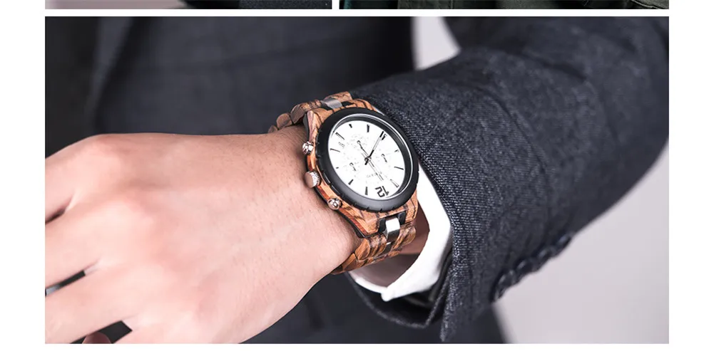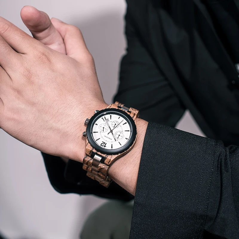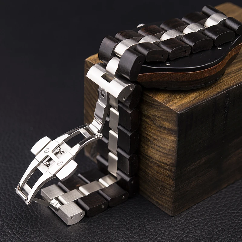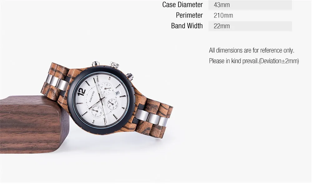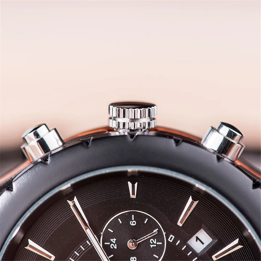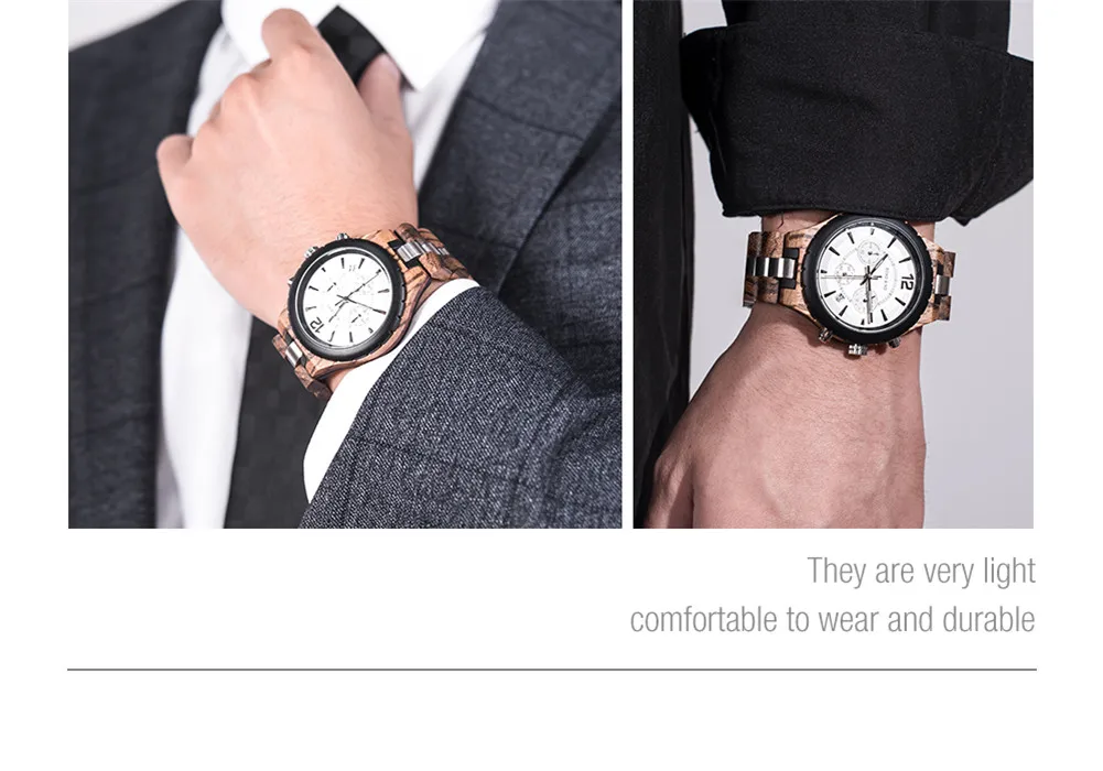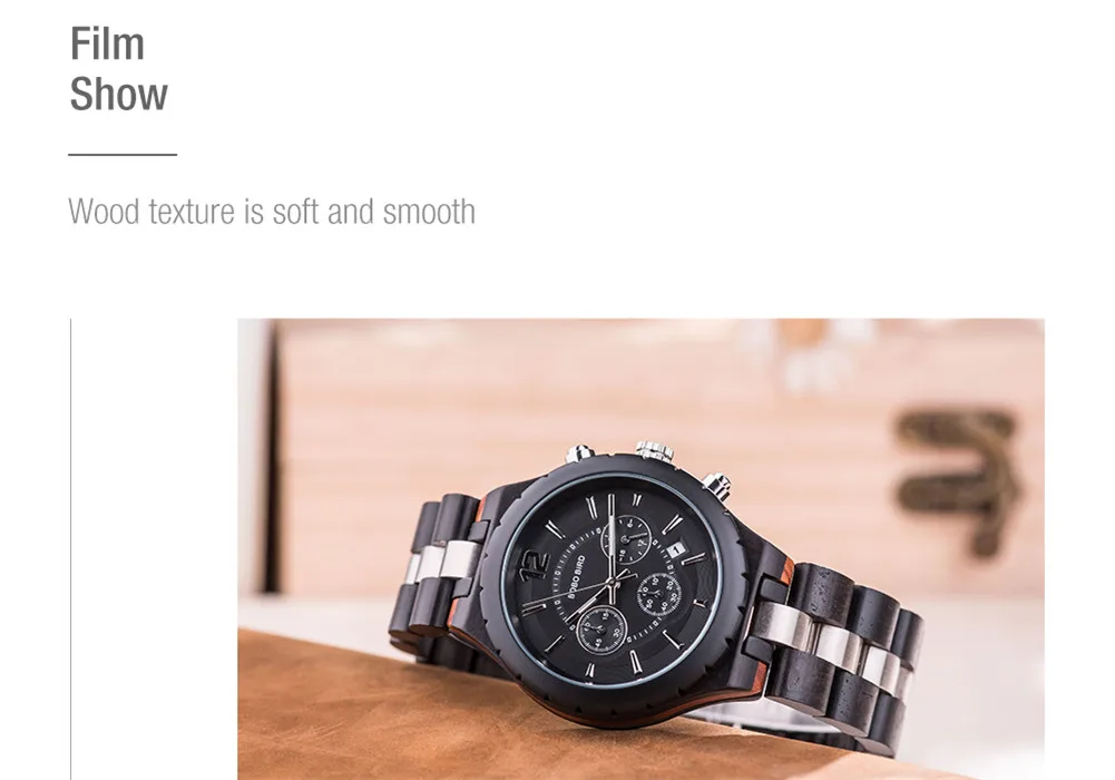 Мужские часы BOBO BIRD с деревянным ремешком, мужские деловые наручные часы с хронографом, часы с браслетом из нержавеющей стали в деревянной подарочной коробке