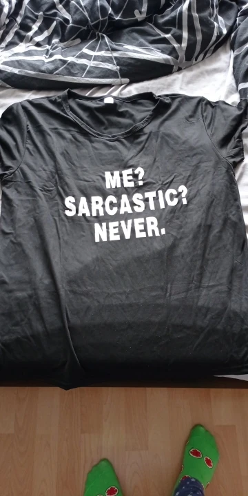 Футболка среднего качества, текстура немного грубая, а материал больше полиэстера, чем хлопок. Принт букв немного плохой, я не думаю, что он прослужит долго. Я получил Размер S-M, и я заказал размер S, он мне подходит.