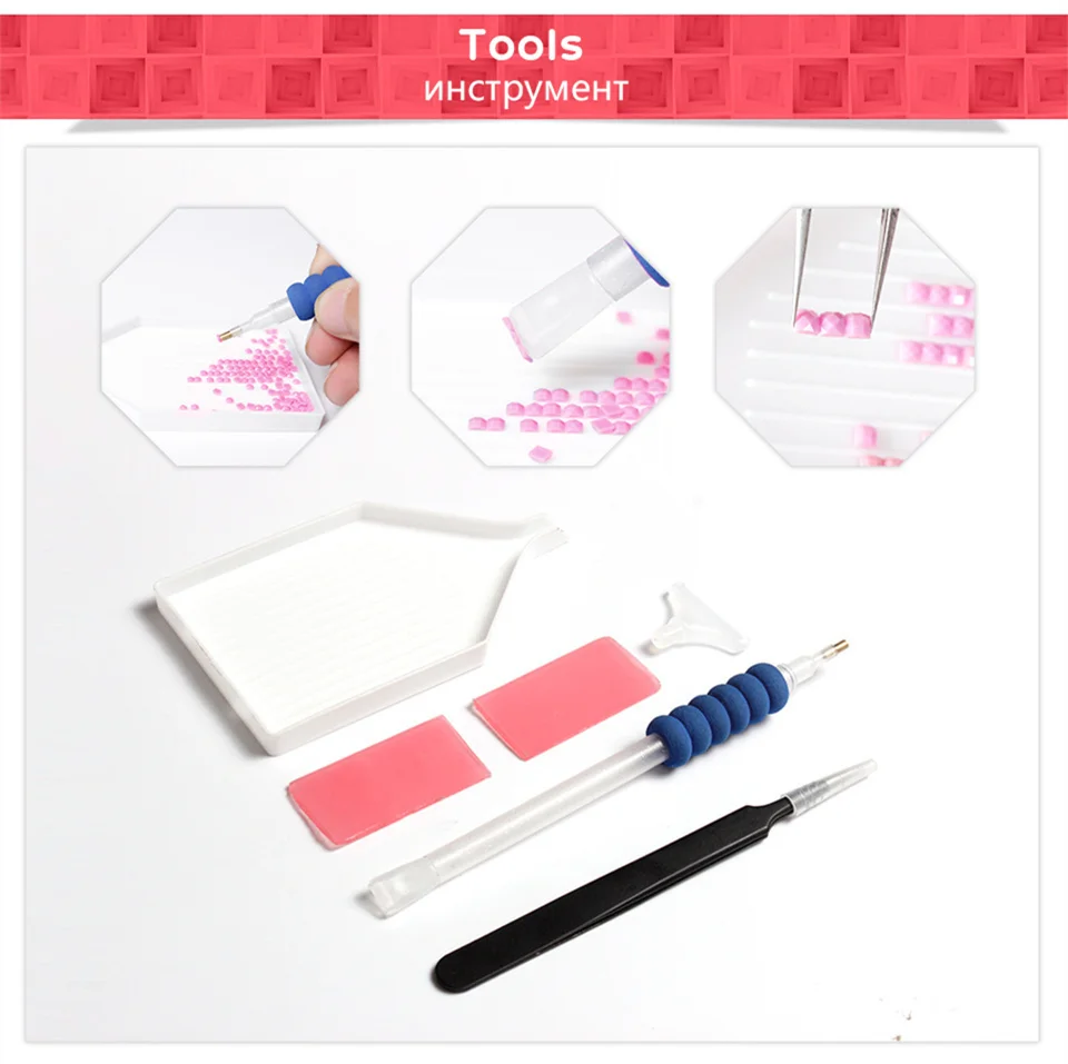 Инструменты включают в себя: алмазную пластину, клей, пинцет, ручки (наклеить 10 бриллиантов одновременно)