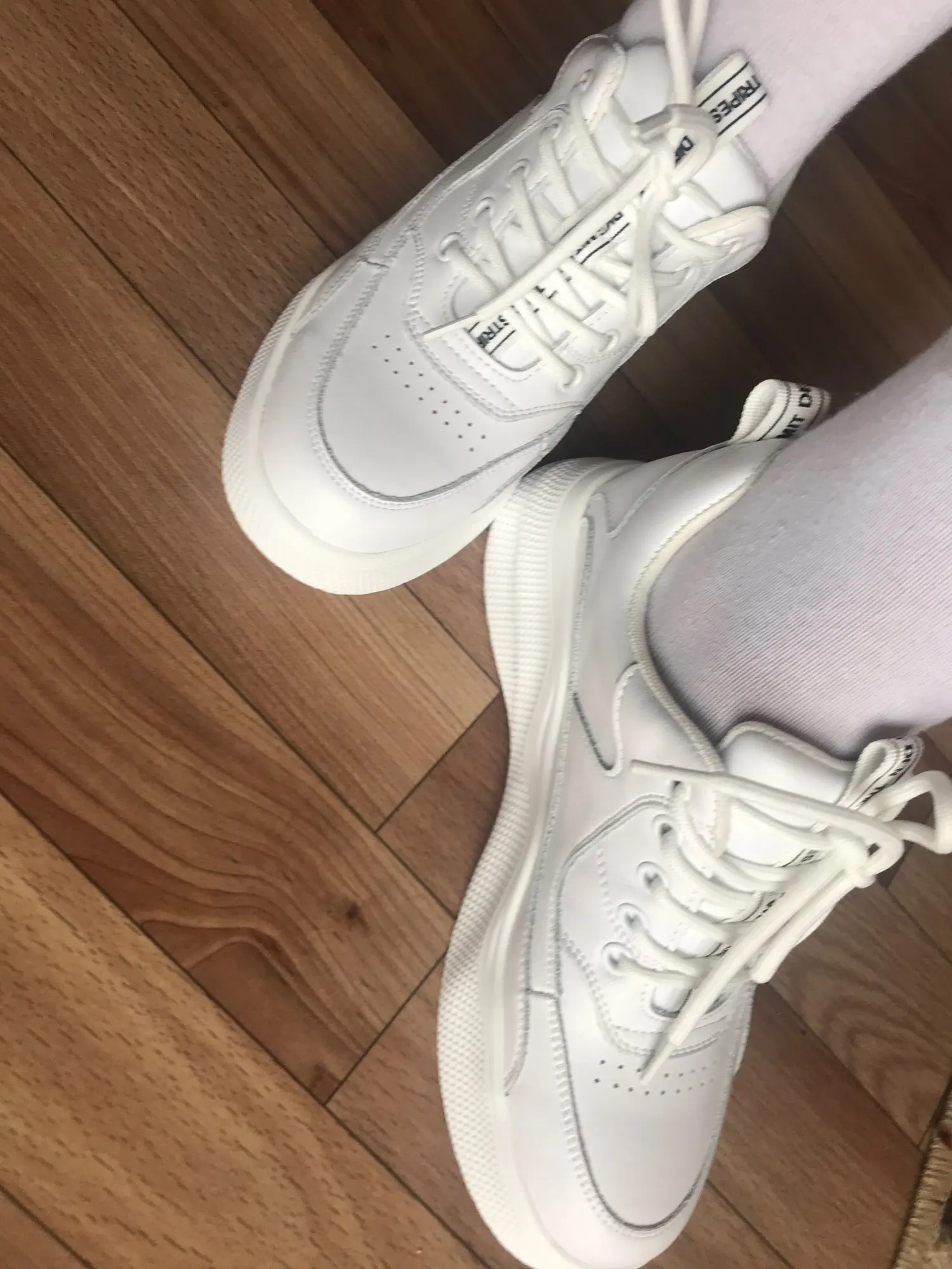 Отличные кроссовки, качественно выполнены, скорее всего не кожа, а спилок. На размер 37 заказала 38, все подошло. В ширину сидят на ноге довольно плотно, подойдут на узкую ногу. В кроссовках были пенопластовые формы, чтобы обувь не помялась при доставке, в подарок пара стелек.