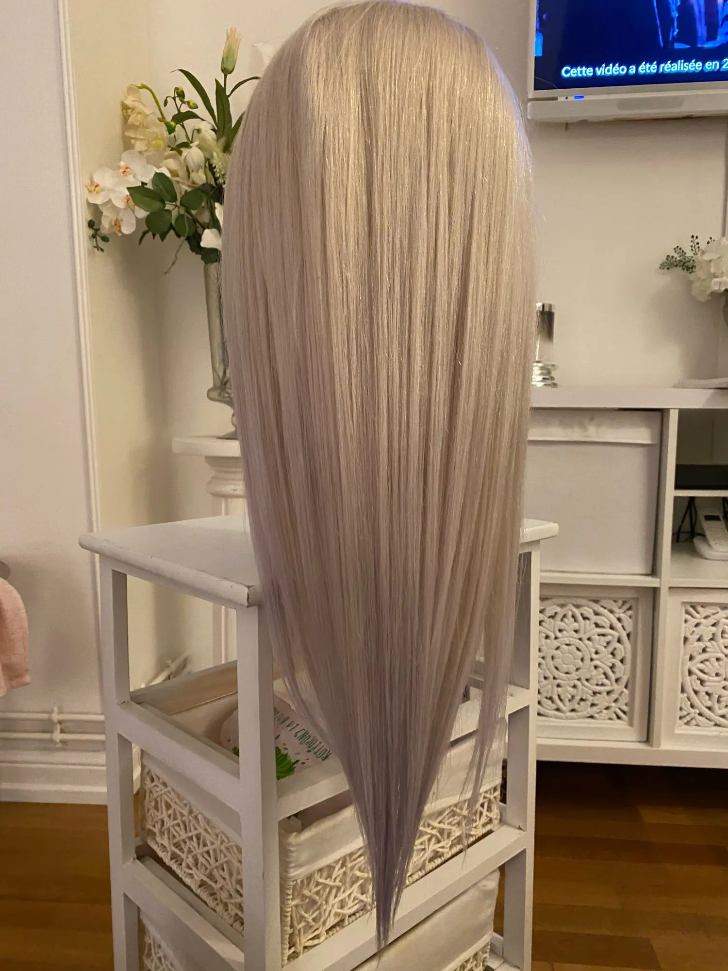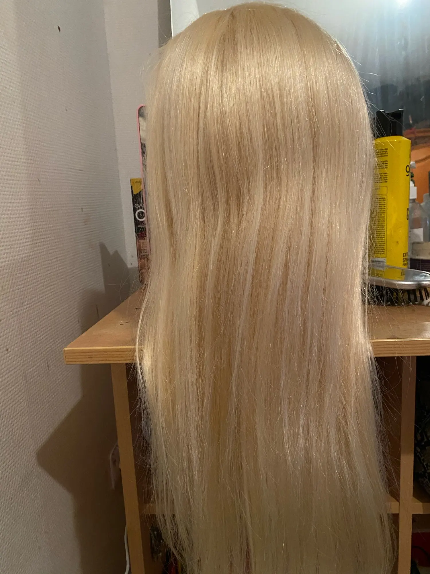 Волосы фантастические! Блонд, который пришел, мне не очень понравился, и с простым фиолетовым шампунем, чтобы матировать листья, он почти серый! Единственный хит, который я надел, заключается в том, что при стирке вы не даете прямой струи кружевному фронту, так как он вставляет волосы внутрь, и вы должны разрезать их, и вы теряете плотность. В противном случае идеально!