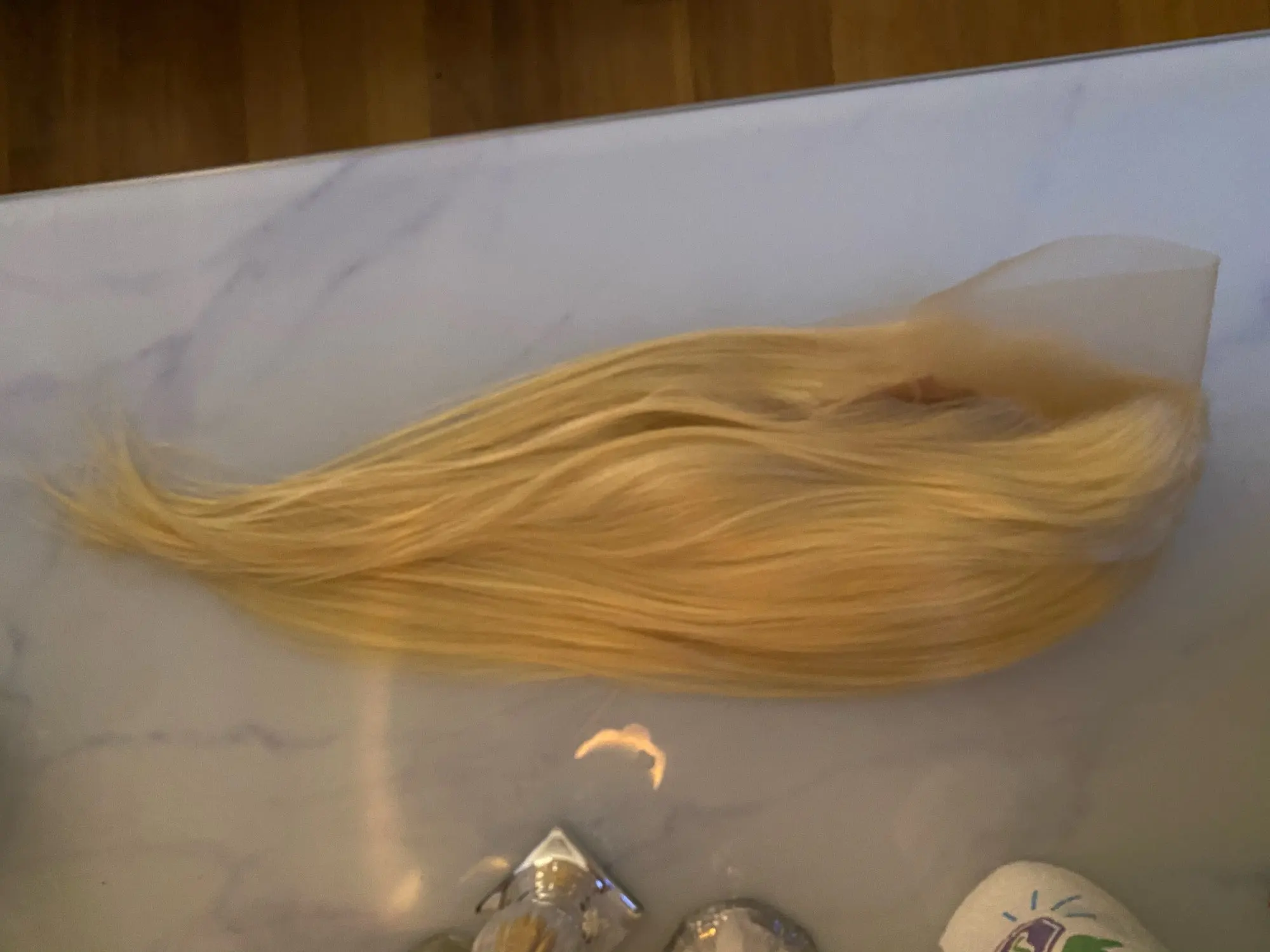 Волосы появились раньше, чем ожидалось! Очень мягкий. Я пробежал пальцами несколько раз и получил немного, чтобы не линять. Цвет блонд, который он пришел, тоже красивый, но я все еще могу немного покрасить его. Я не могу дождаться, чтобы попробовать этот парик! Я буду заказывать снова.