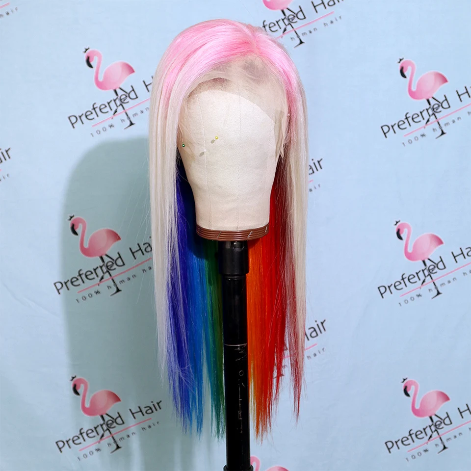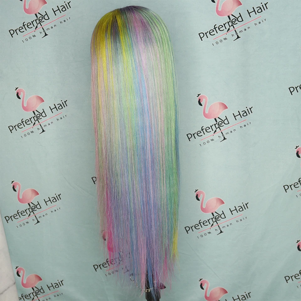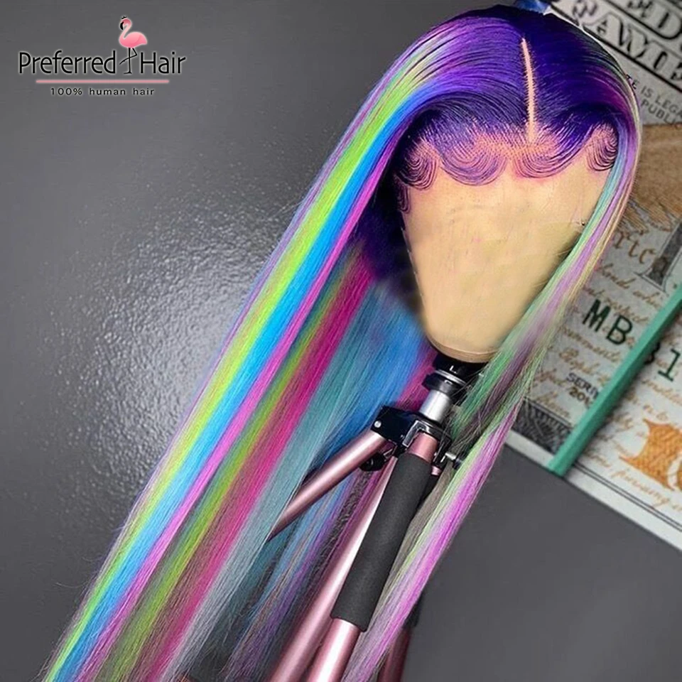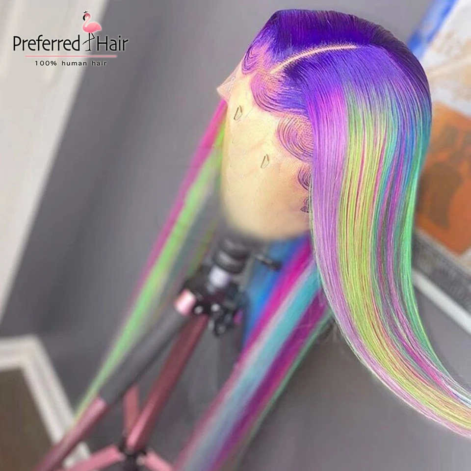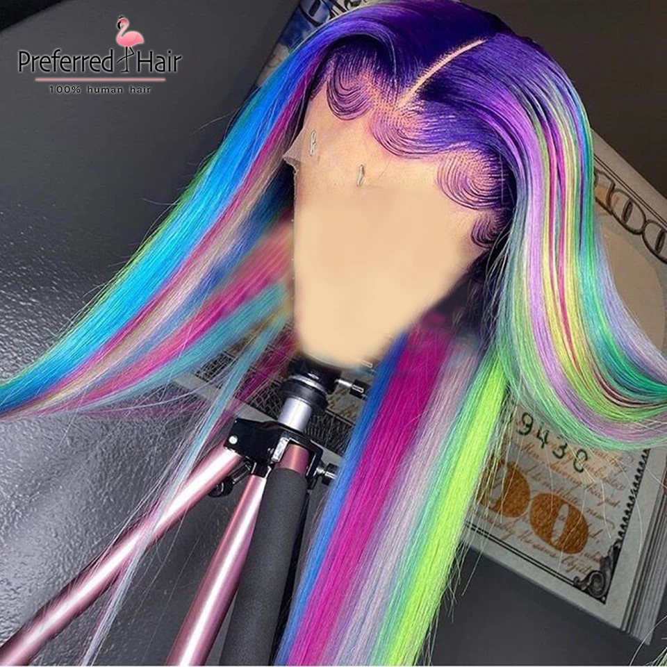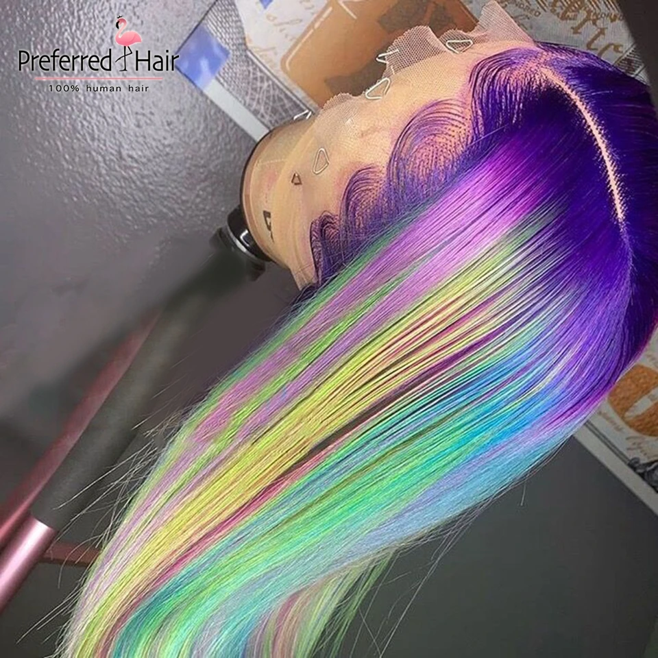 Волшебный парик из человеческих волос радужной расцветки, бразильский прямой парик с Реми, парик с эффектом омбре, зеленый, фиолетовый, розовый, хайлайтер, парики для черных женщин