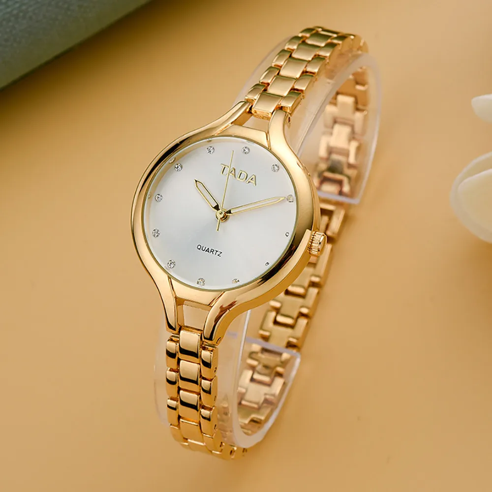 Женские повседневные роскошные золотые часы, кварцевые аналоговые классические бриллиантовые Наручные часы из нержавеющей стали, женские часы с кристаллами QC
