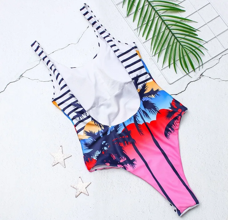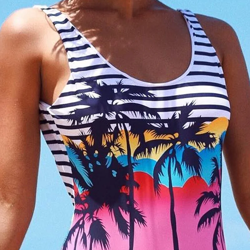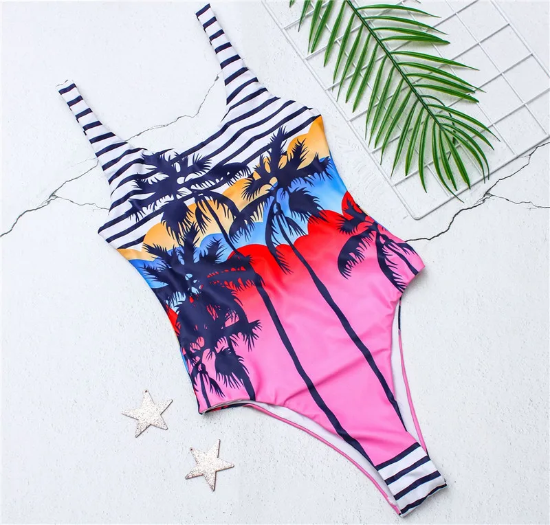 Новинка 2021, сексуальный слитный женский купальник на бретелях с принтом пальм, купальный костюм, размера плюс боди, купальник в полоску