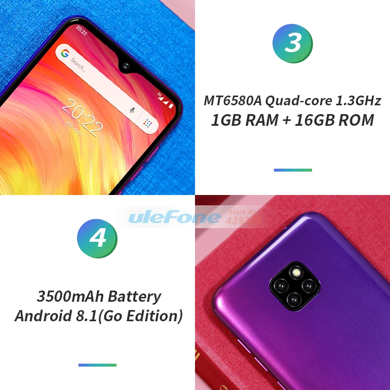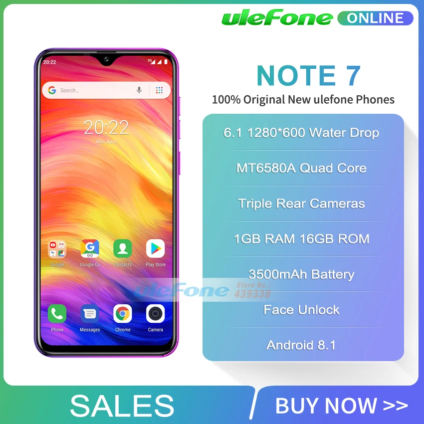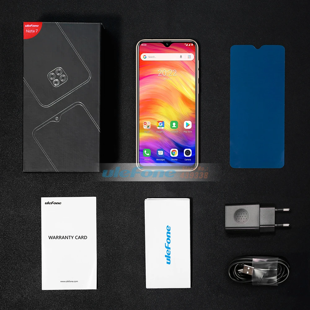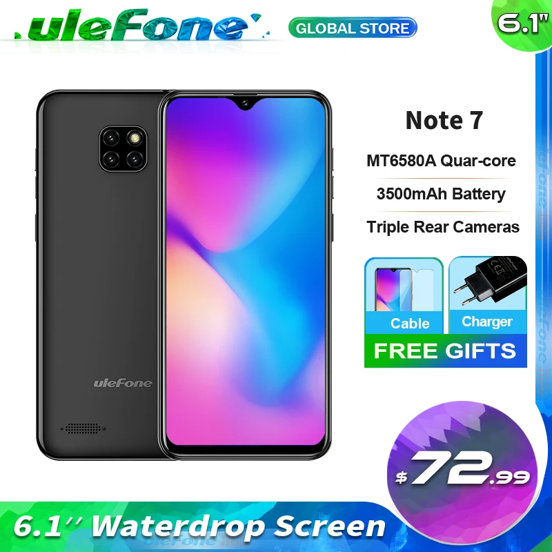 Смартфон Ulefone Note 7 6,1 дюйма, 1 Гб ОЗУ, 16 Гб ПЗУ, четырехъядерный MT6580A, 3500 мАч, Face ID, тройная основная камера, мобильный телефон с Android 9