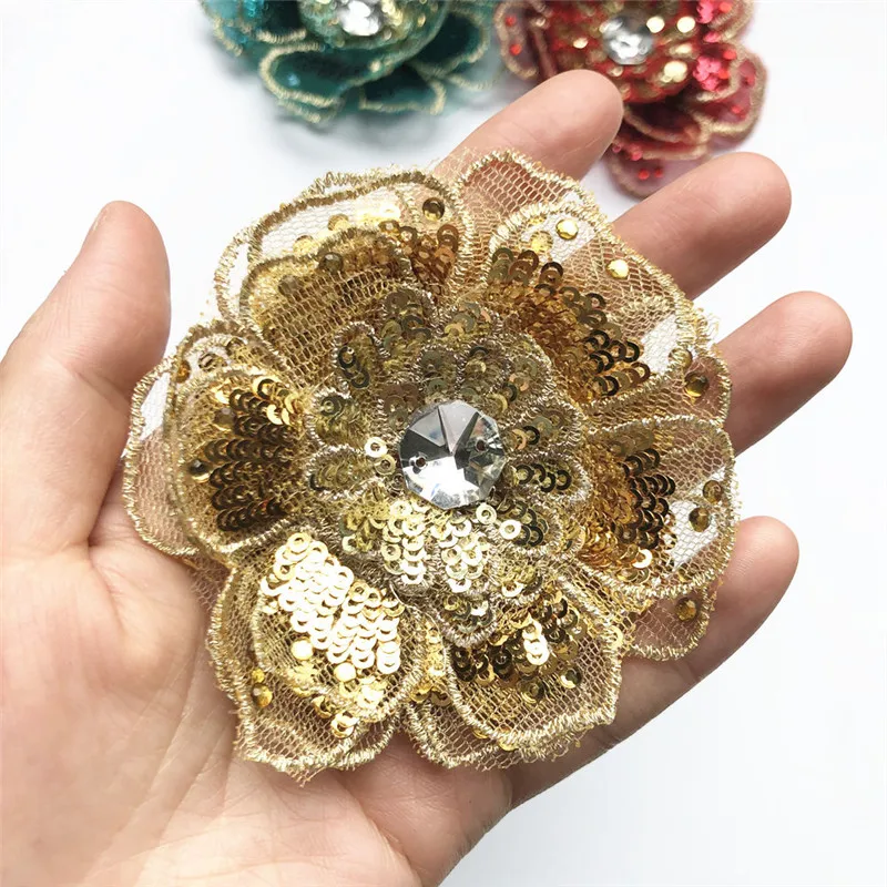 Вышивка 8 см, 3D золотая Цветочная головка, ПРИШИТАЯ нашивку, отделка из сетки, кружева, многослойные украшения для свадебных платьев с аппликацией