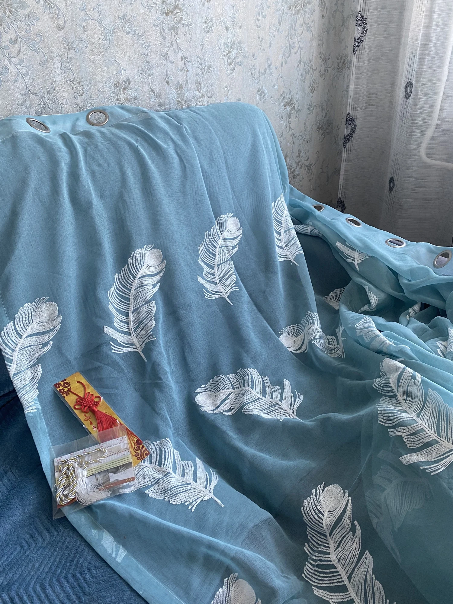 Вышитые шторы с изображением перьев, чистые прозрачные окна, современные шторы для гостиной, спальни, белые, синие тюлевые шторы, занавески