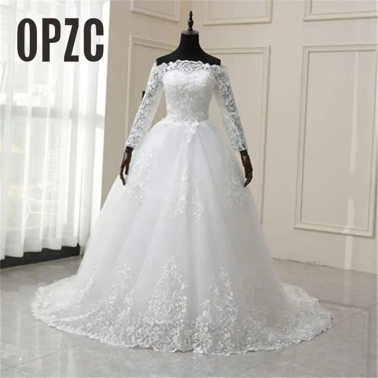 Роскошные кружевные свадебные платья со шлейфом 100 см, длинные Бальные платья с вышивкой, белые цвета слоновой кости, вырез лодочкой, открытые плечи, длинные рукава, тюль для невесты