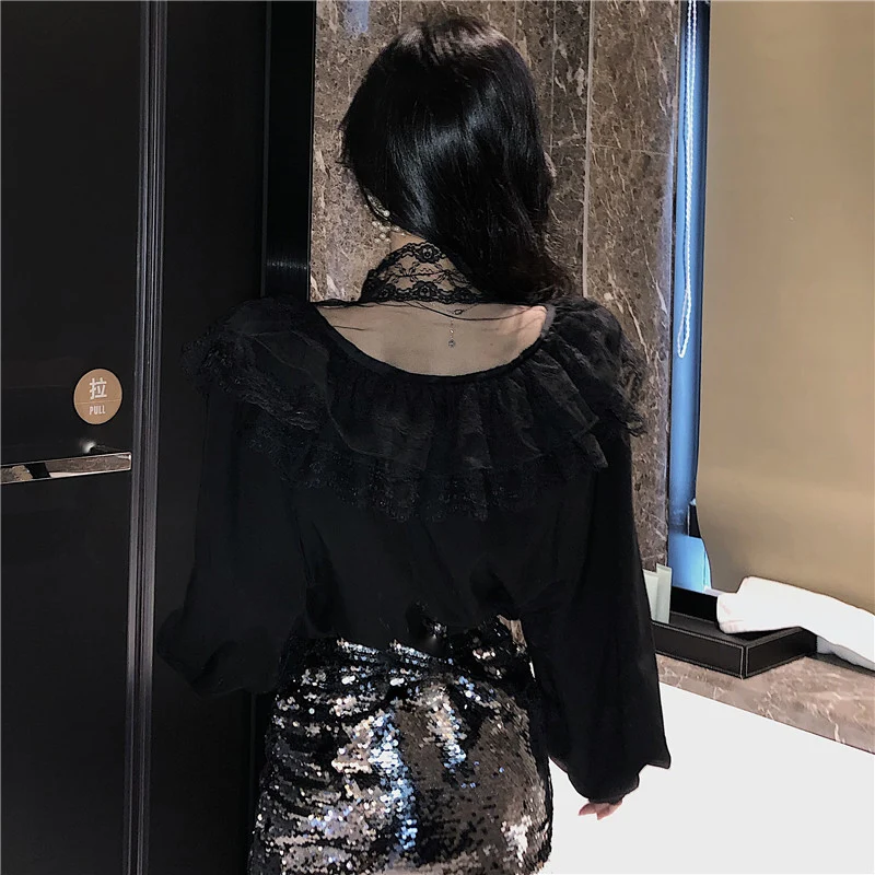 Женская Кружевная блуза с рукавами-фонариками и воротником-стойкой