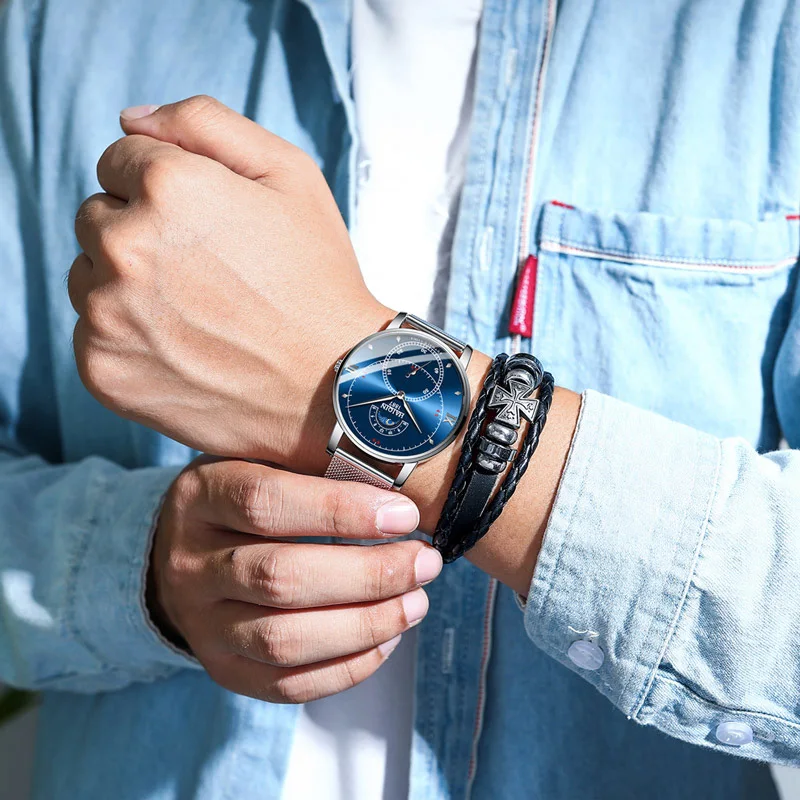 -Новые и качественные-Точный кварцевый часовой механизм, показывающий точное время.-Многофункциональность-Водонепроницаемость 30 метров-Браслет из нержавеющей стали или кожаный ремешок -Водонепроницаемые часы с люминисцентными стрелками Часы
