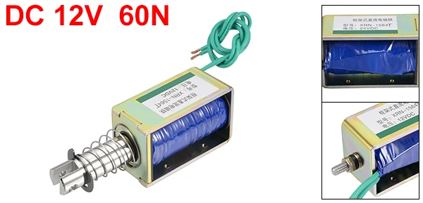 Нажимной Тяговый тип, линейное движение, плунжерный пружинный возврат, электромагнит постоянного тока.