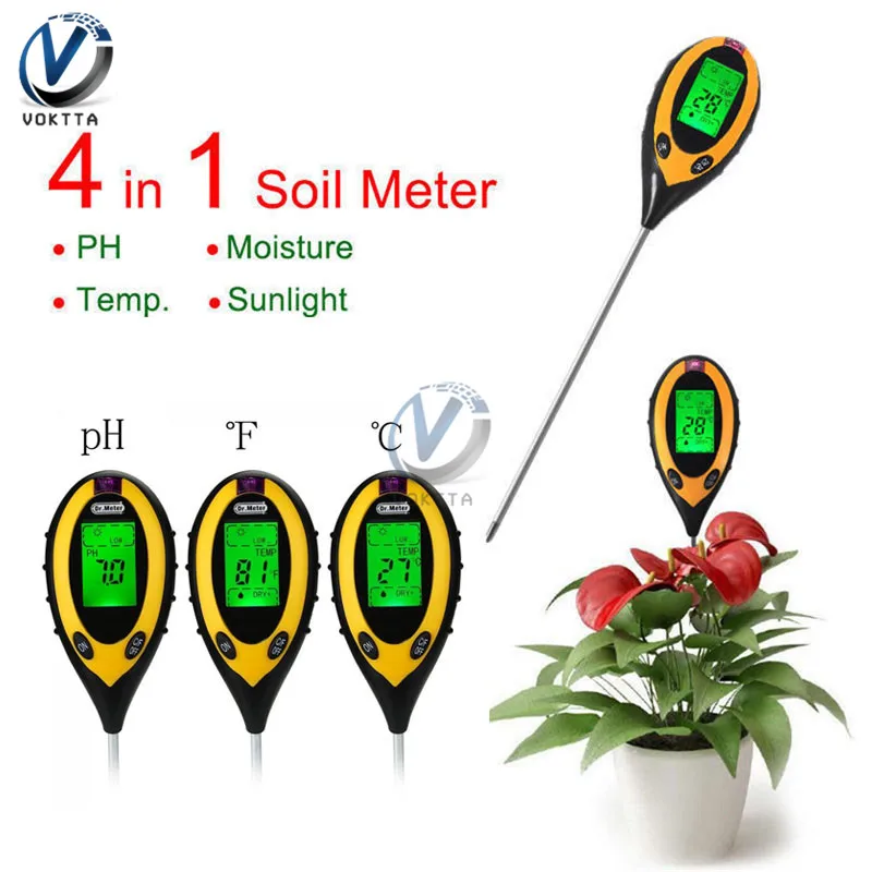 4 в 1 прибор для исследования почвы может проверить влажность, значение PH, температуру и окружающую среду интенсивность солнечного света почвы, что более удобно.
