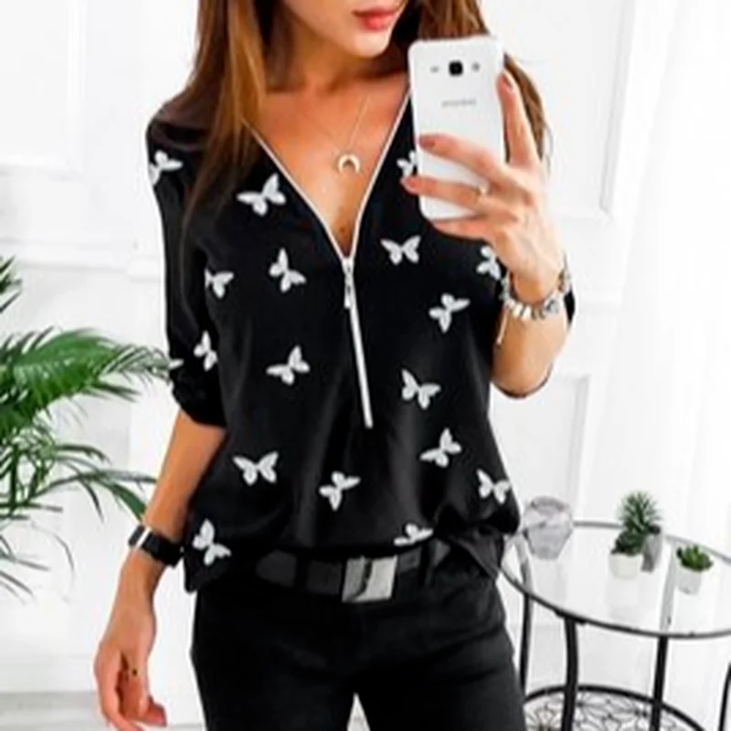 Блузка женская с V-образным вырезом, топ на молнии, Классическая Свободная рубашка с длинным рукавом, большие размеры 4XL 5XL, весна платье в горошек с цветочным принтом