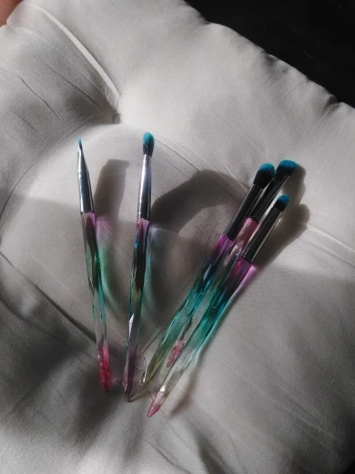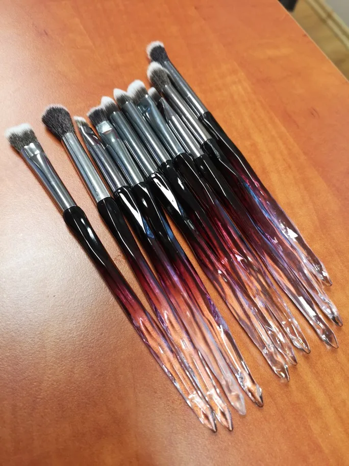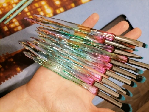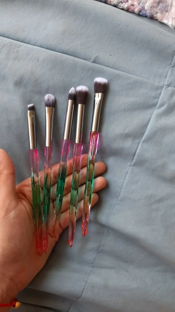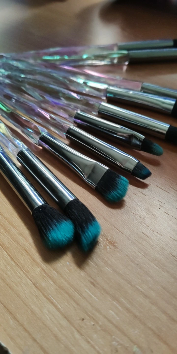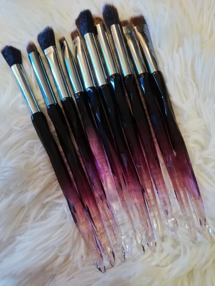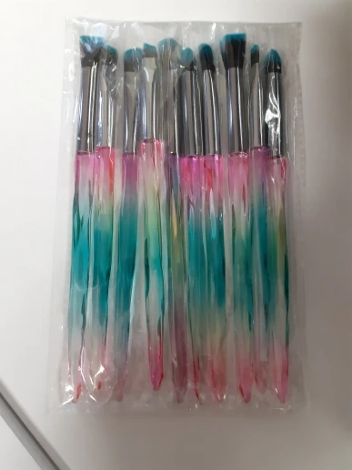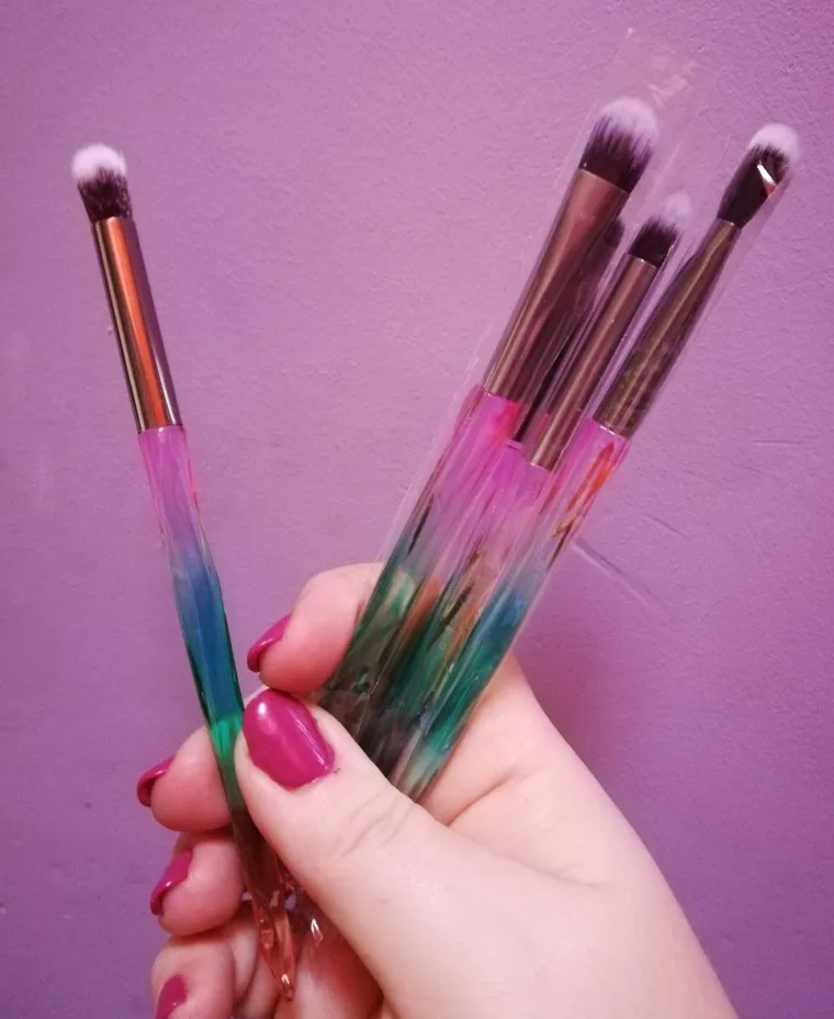 Кисти пришли быстро. Качество, на удивление, порадовало, тут в отзывах писали, что при первом же применении линяют, у меня уже пару месяцев всё великолепно. Сами кисти не длинные, что удобно, и расцветка - одно наслаждение, думала, что она подведёт, но нет, очень красиво. Цвет набирают хорошо и передают также, может чуток пылят, но это не проблема. За свою цену, кисти очень хороши!