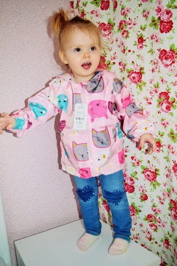 Ветровка отличная, цвет красивый, как на фото. На ребёнка 1,3 года рост 78 см размер 3т хорошо сел, есть запас, прикрывает попу, но за счёт рукава на манжетах их подкатывать не нужно.
