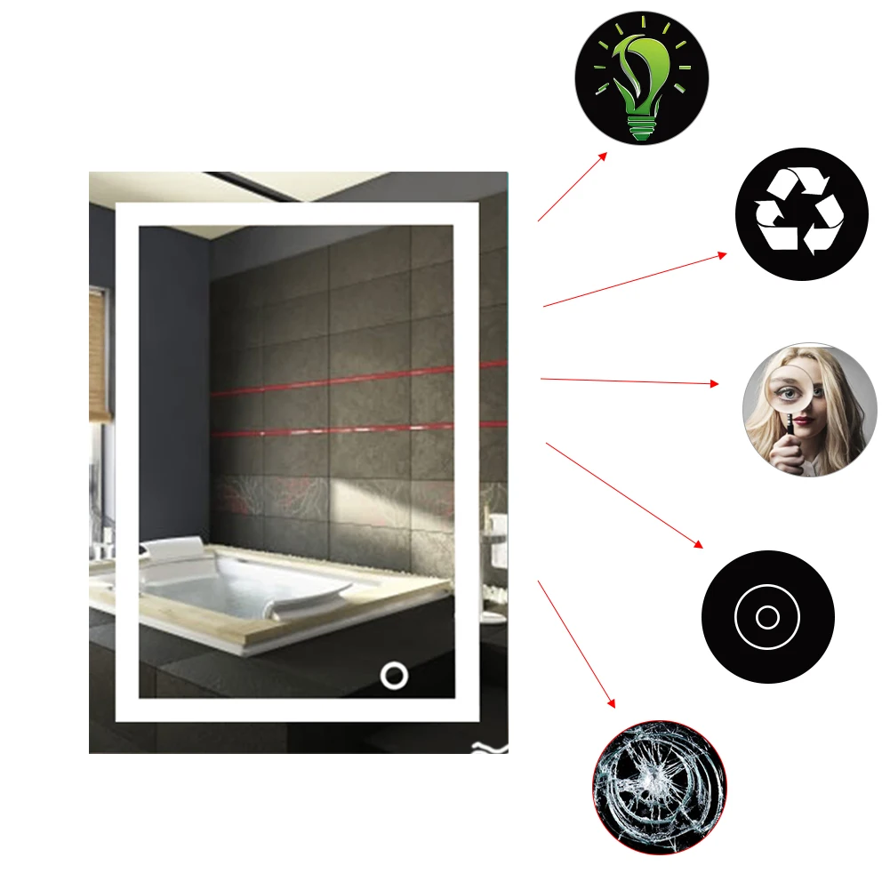 -100% новый и высокое качество -Светодиодное настенное зеркало для ванной комнаты с подсветкой, косметическое зеркало с сенсорной кнопкой -Светодиодное зеркало с сенсорной кнопкой -Простота установки. -Алюминиевая рама с влагостойкой полосой -Лаки светодиодного зеркала, влагостойкие Характеристики: Тип фитинга: настенный Материал оправы: алюминий Освещение: светодиод Размер: 500x700 мм/600x800мм