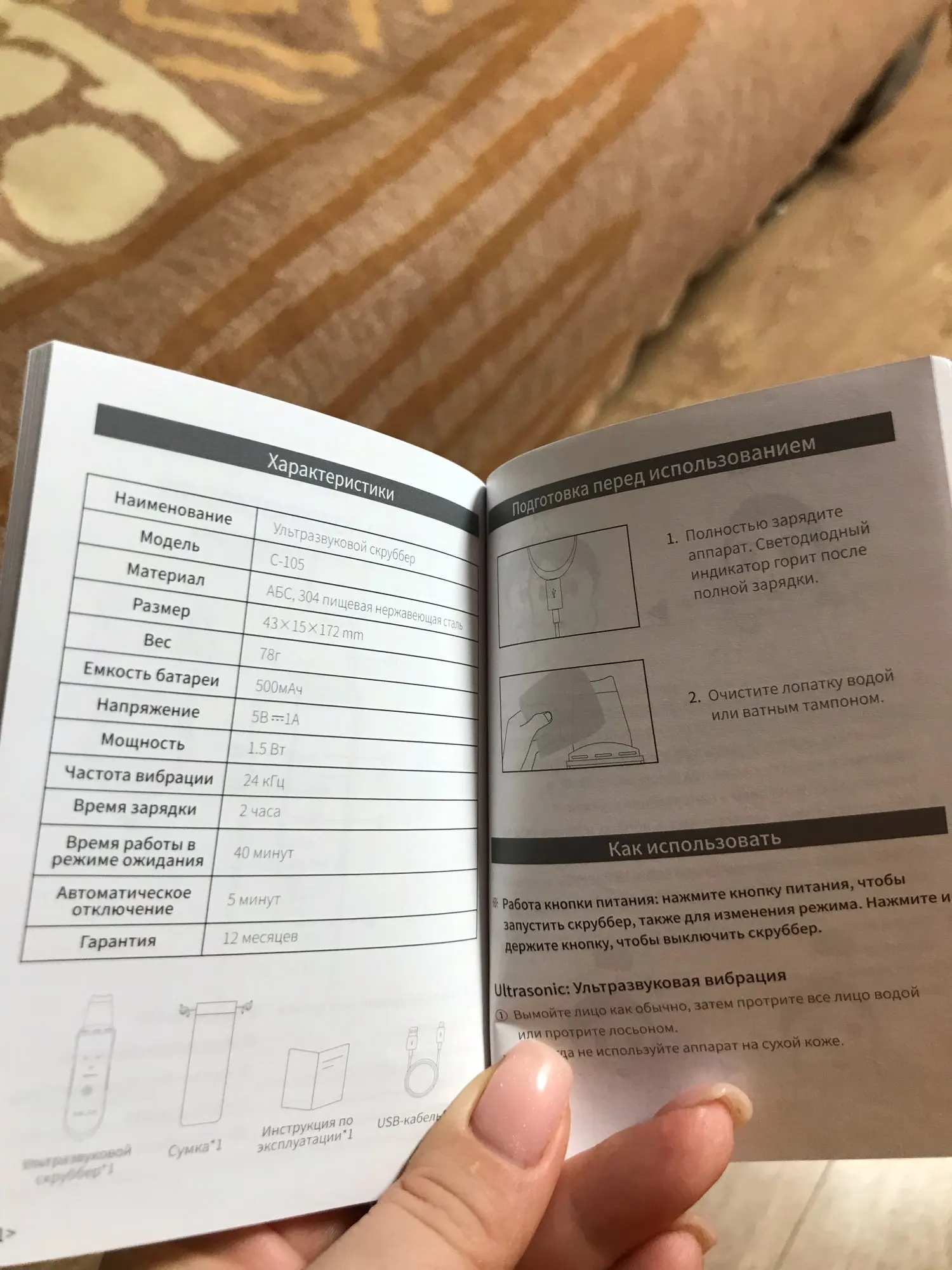 Быстрая доставка, в течении 10 дней был уже у меня. Есть инструкция где все подробно описано! Все прекрасно упаковано. Ещё не пользовалась, но думаю скруббер очень полезная вещь по уходу за кожей.