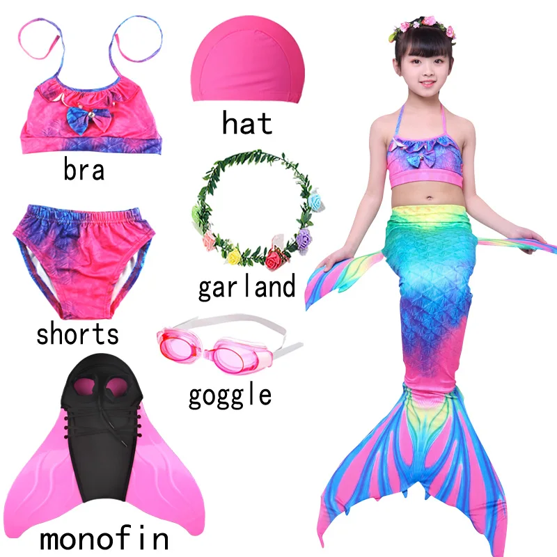 7 шт.: хвост русалки + бюстгальтер + шорты + шапка + гирлянда + очки + монофин