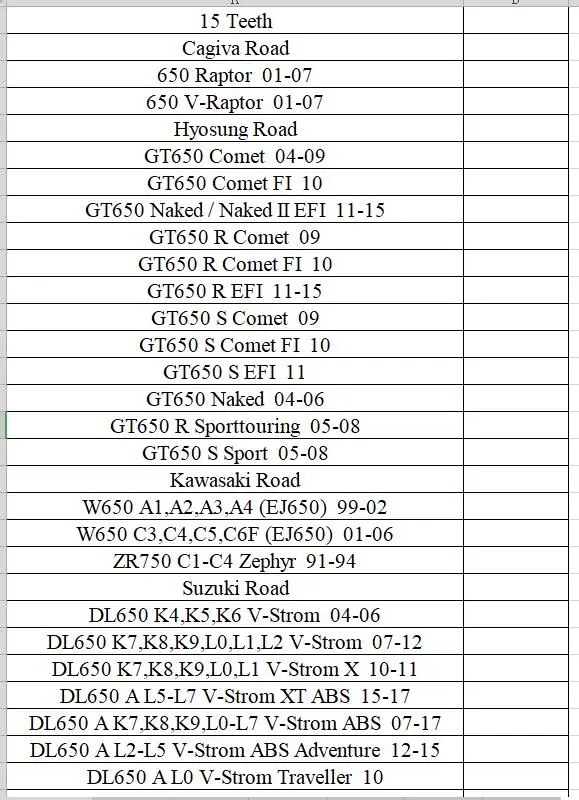 15 зубов Cagiva дорога 650 Раптор 01-07 650 в-Раптор 01-07 Хайсун роуд GT650 комета 04-09 GT650 комета FI 10 GT650 Naked / Naked II EFI 11-15 GT650 R комета 09 GT650 R комета FI 10 GT650 R EFI 11-15 GT650 S комета 09 GT650 S комета FI 10 GT650 S EFI 11 GT650 голый 04-06 GT650 R Sporttouring 05-08 GT650 S Спорт 05-08 Кавасаки роуд W650 A1,A2,A3,A4 (EJ650) 99-02 W650 C3,C4,C5,C6F (EJ650) 01-06 ZR750 C1-C4 Zephyr 91-94 Сузуки роуд DL650 K4,K5,K6 V-Strom 04-06 DL650 K7,K8,K9,L0,L1,L2 V-Strom 07-12 DL650 K7,K8,K9,L0,L1 V-Strom X 10-11 DL650 A L5-L7 V-Strom XT ABS 15-17 DL650 A K7,K8,K9,L0-L7 V-Strom ABS 07-17 DL650 A L2-L5 V-Strom ABS Adventure 12-15 DL650 A L0 V-Strom Traveler 10 DL650 A L0 V-Strom GT 10 DL650 A L5,L6 V-Strom XT ABS 2015-2016 гг. DL650 SEA L0,L1,L2 V-Strom Touring 12-10 GSF650 K7,K8,K9 бандит 07-09 GSF650 L0,L1 бандит 10-11 GSF650 SA-K7,K8,K9,L0,L1,L2,L3,L4,L5 Bandit (ABS) 07-15 GSF650 S-L0 Bandit путешественник 10 GSX650 F/FA-K8,K9,L0,L1,L2,L3,L4,L5,L6 08-16 SV650 X,Y,K1,K2,K3,K4,K5,K6,K7,K8 99-08 SV650 S-X,Y,K1,K2,K3,K4,K5,K6,K7,K8,K9 99-09 SV650 S-L0,L1,L2,L3 10-13 SV650 A/SA-K7,K8,K9,L0 (ABS) 07-10 16 зубов Cagiva дорога Навигатор 1000 01-05 Кавасаки роуд ZR-7 (ZR750 F1-F5) 99-04 ZR-7S (ZR750S H1-H3) 01-04 ZX-7R (ZX750 P1-P8) ниндзя 96-03 ZX-7RR (ZX750 N1-N2) ниндзя 96-99 Сузуки роуд GSR600 K6,K7,K8,K9,L0 06-10 GSR600 B йошимура 10 GSX-R600 в 97 GSX-R600 Вт, X 98-99 GSX-R600 Вт, X,Y 98-00 GSX-R600 K1,K2,K3,K4,K5 01-05 GSX-R600 K6,K7,K8,K9,L0 06-10 GSX-R600 L1,L2,L3,L4,L5,L6 11-16 Мотоцикл GP GSX-R600 16 дюймов GSX-R750 WW,X SRAD впрыска топлива 98-99 Дорога Триумф 675 Daytona 11-16 675 Daytona R 06-16 675 Street Triple 08-16 675 Street Triple R 10-16 800 тигр 11-16 800 Tiger XC 11-16 800 Tiger XCA 16 дюймов 800 Tiger XCX 15-16 800 Tiger XR 15-16 800 Tiger XRT 16 дюймов 800 Tiger XCX 15-16 Yamaha дорожный TDM8503VD 91-95 TDM8504TX 99-01 17 зубов Сузуки роуд GSR750 L1-L6 (АБС-пластик) 11-16 GSR750 Z (ABS) 16-17 GSX-R750 Y,K1-K3 впрыск топлива SRAD 00-03 GSX-R750 K4,K5 впрыск топлива 04-05 GSX-R750 K4,K5 впрыск топлива 04-05 GSX-R750 K6,K7,K8,K9,L0 06-10 GSX-R750 L1,L2,L3,L4,L5,L6 11-16 GSX-R750 L1,L2,L3,L4,L5,L6 Мотоцикл GP GSX-R750 16 дюймов GSX-S750 L5-L6 15-16 GSX-S750 Z 15 DL1000 K2,K3,K4,K5,K6,K7,K8,K9,L0 V-Strom 02-10 DL1000 K2,K3,K4,K5,K6,K7,K8,K9,L0 V-Strom DL1000 SE L0 V-Strom 10 DL1000 SE/SEA L0,L1,L2 V-Strom Touring DL1000 L4,L5,L6 V-Strom ABS 14-16 DL1000 A-L5,L6 V-Strom ABS Adventure 15-16 DL1000 A-L6 V-Strom ABS Desert 16 дюймов DL1000 A-L6 V-Strom ABS спорт 16 дюймов GSX-R1000 K1,K2,K3,K4,K5,K6 <525 преобразование цепи 01-06 GSX-R1000 K7,K8 <525 преобразование цепи 07-08 GSX-S1000 L5,L6,L7 15-17 GSX-S1000 F-L5,L6,L7 15-17