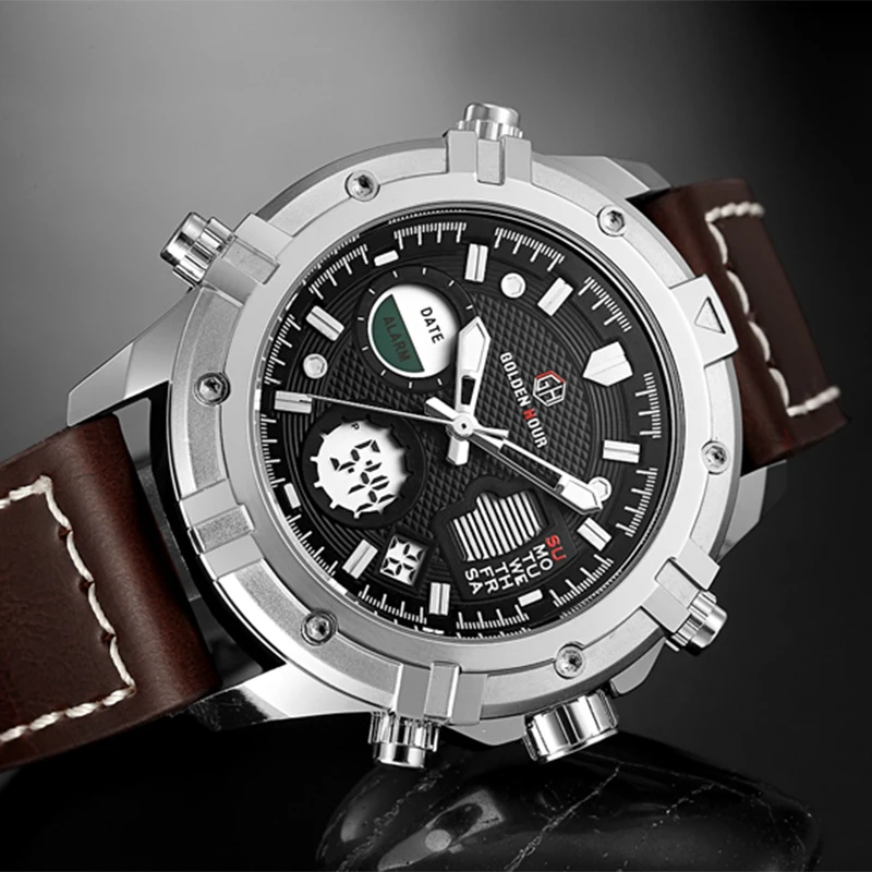 Часы наручные GOLDENHOUR Мужские кварцевые, брендовые модные спортивные армейские в стиле милитари, с двойным дисплеем и кожаным ремешком