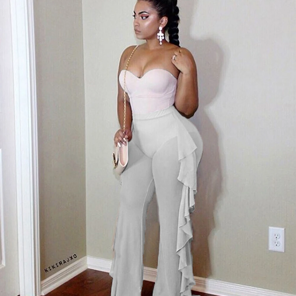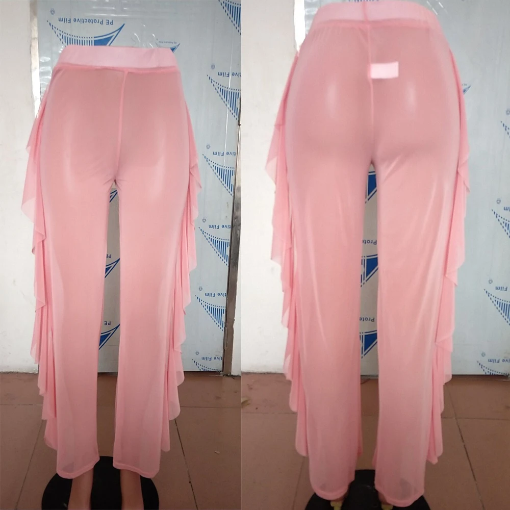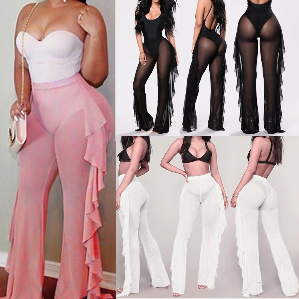 Сексуальные женские пляжные сетчатые шифоновые оборки, прозрачные широкие брюки, свободные накидки на бикини, прозрачные расклешенные брюки с высокой талией