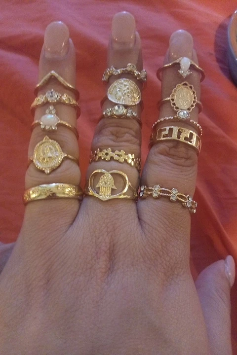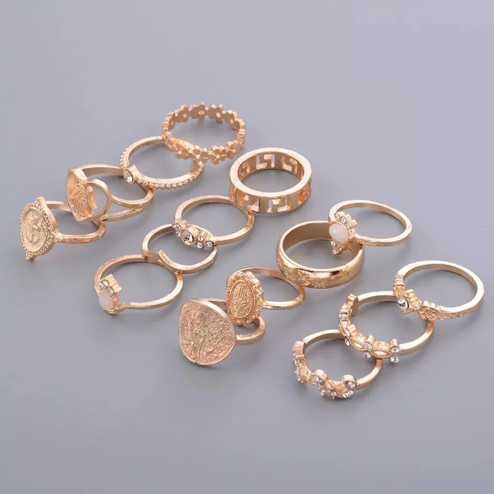 Комплект колец с декором под драгоценный камень Женский, комплект золотых колец с резным цветочным крестом, изящная Подарочная бижутерия, сердце, рука Фатима, кристаллы, листья, опал, драгоценный камень, 15 шт.компл.