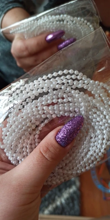 товар соответствует описанию. Визуально бусины кажутся меньше заявленных 5 мм, но при замере все оказалось верно. Длинна изделия больше 5 метров. Внутри был подарок. Спасибо.