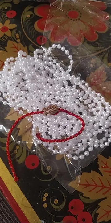 Шло долго, бусы как бусы, средненького качества. Продавец положил подарок - красную нить с неким идолом)