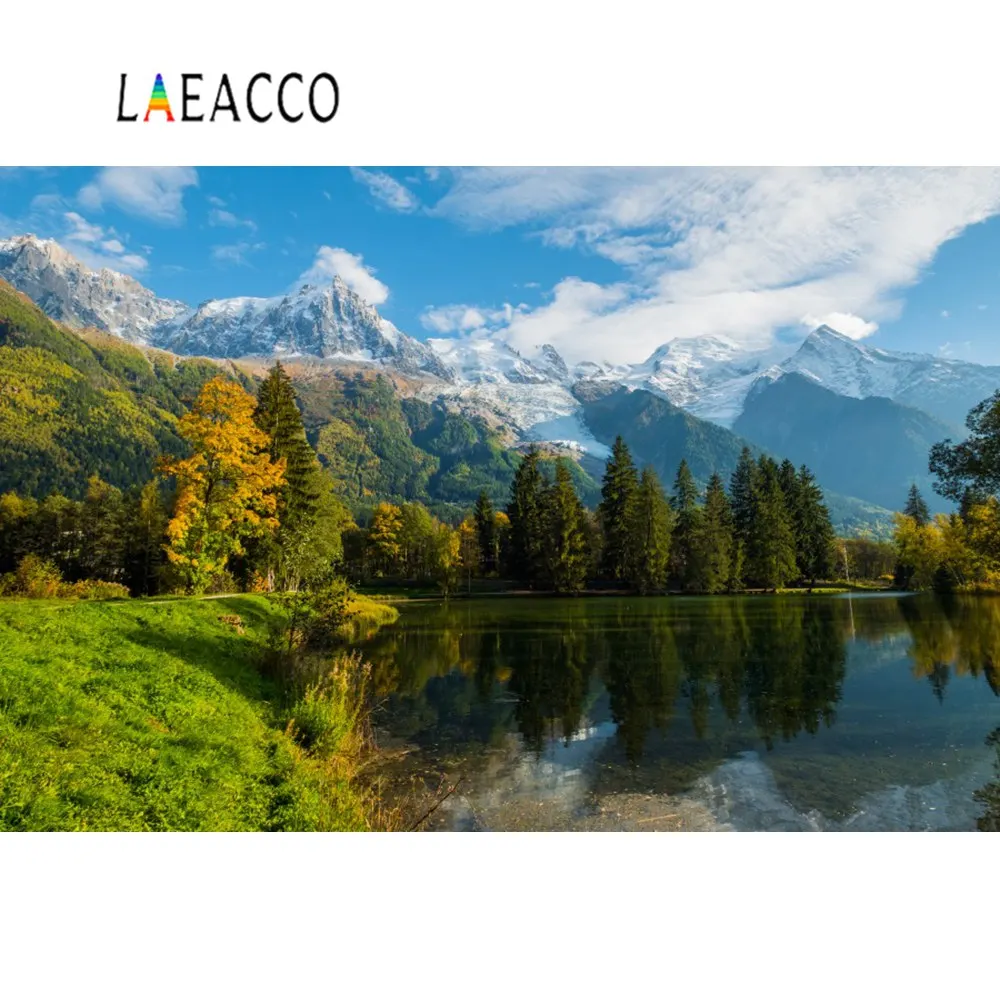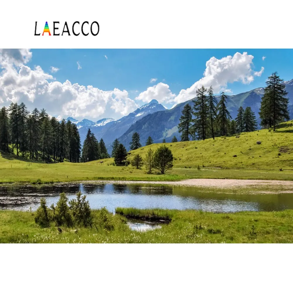 Природные фоны озеро горное дерево лес Зеленая трава голубое небо облачно Живописные фоны для фотосъемки Фотостудия