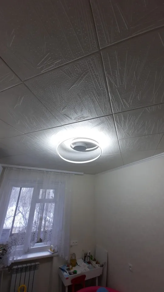 Люстра очень порадовала! Особенно красиво и стильно смотрится уже на потолке! Удобна в использовании. В комплекте пульт с возможностью регулировки яркости освещения и выбора трёх оттенков Света (тёплый/ нейтральный/ холодный) Выглядит дороже своей стоимости