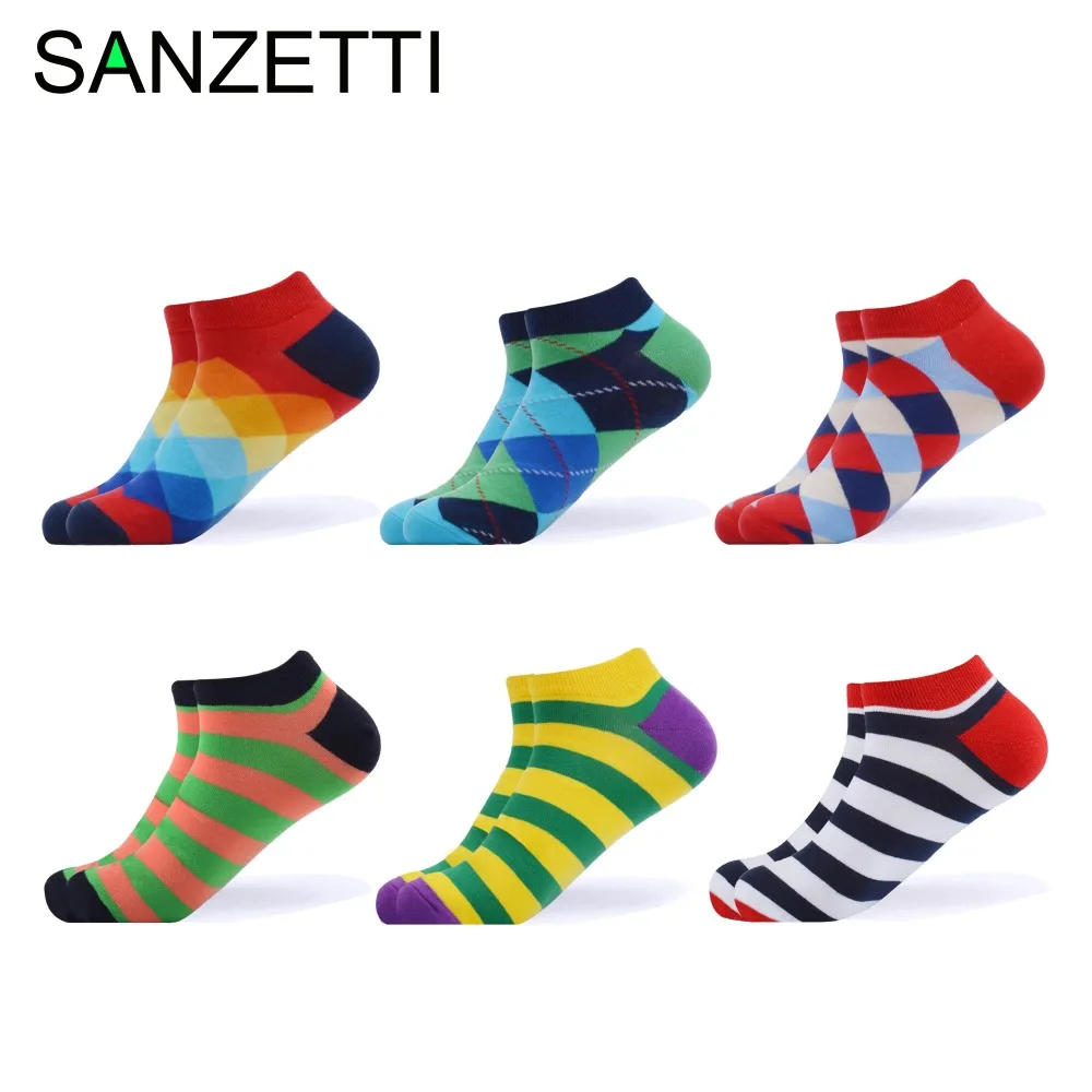 Носки SANZETTI мужские 6 партЛот, повседневные цветные носки до щиколотки из чесаного хлопка, носки-лодочки в клетку и полоску, лето 2020