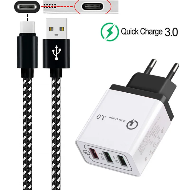 Адаптер QC 3,0 Для Huawei P20 Mate 20 Lite, 5 В, 3 А, быстрая зарядка, Европейское зарядное устройство, USB Type C кабель для Samsung A30, A50, S9, Nokia 8, 8,1, 7,1