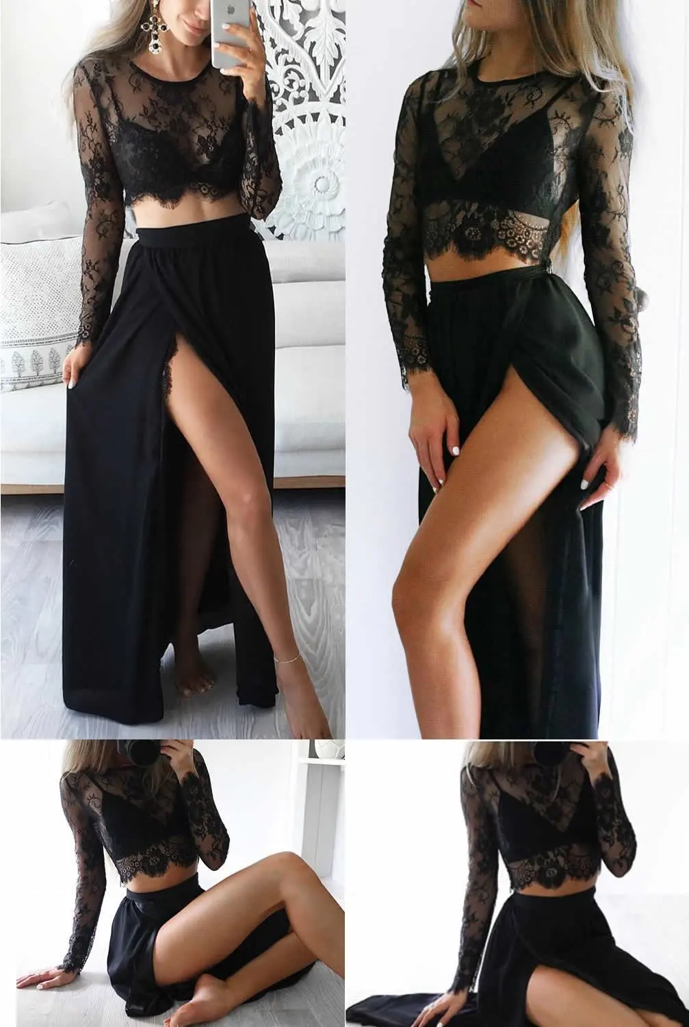 Женское кружевное Прозрачное платье-комбинация Женский комплект 2 шт., черное повседневное пляжное платье с длинным рукавом, комплект из двух предметов, 2019