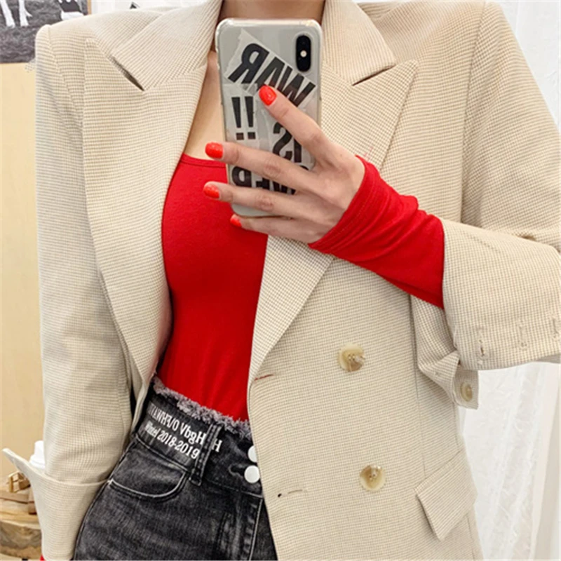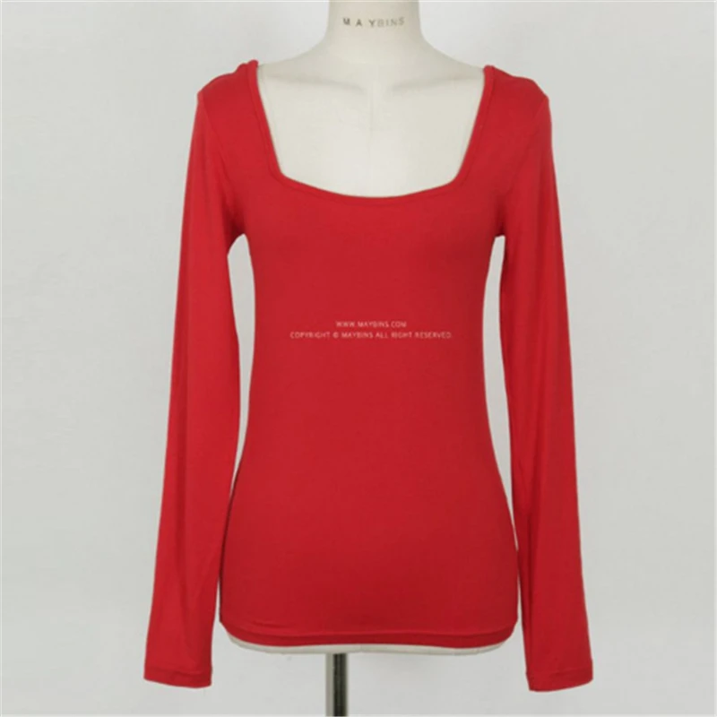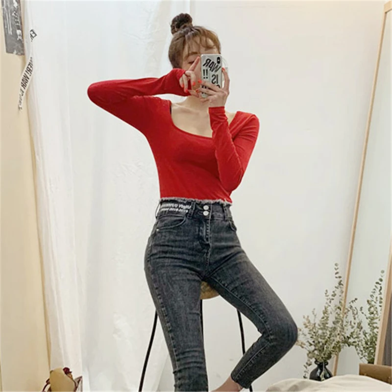 Новинка, хлопковая Сексуальная футболка, Женская эластичная футболка с длинным рукавом, женская одежда, тонкая футболка, женские обтягивающие топы белого, красного, черного цветов