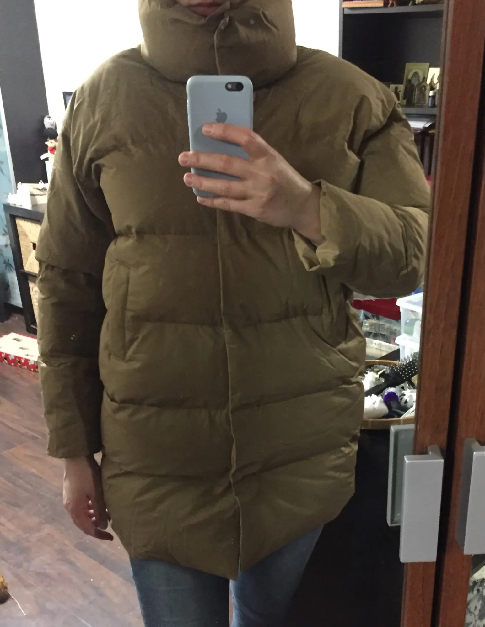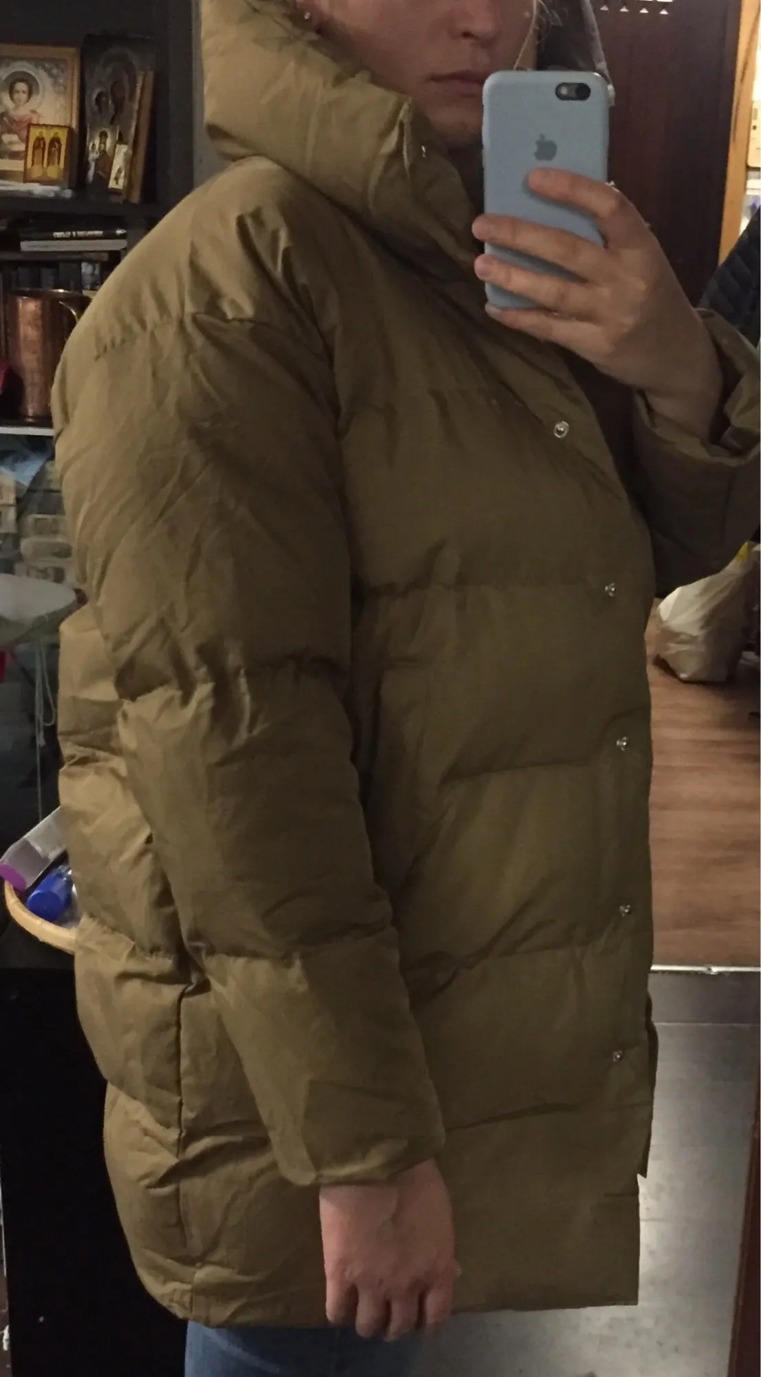 Куртка в целом ничего, но тонковата и кажется неравномерно набитой (особенно если посмотреть на свет). На мой взгляд, кнопки пришиты слишком близко к краю, будет поддувать. Фасон оверсайз, сидит как положено в таких случаях. Поскольку я получила пуховик другого типа из другого магазина, который мне понравился больше, этот я вернула, деньги пришли обратно быстро.