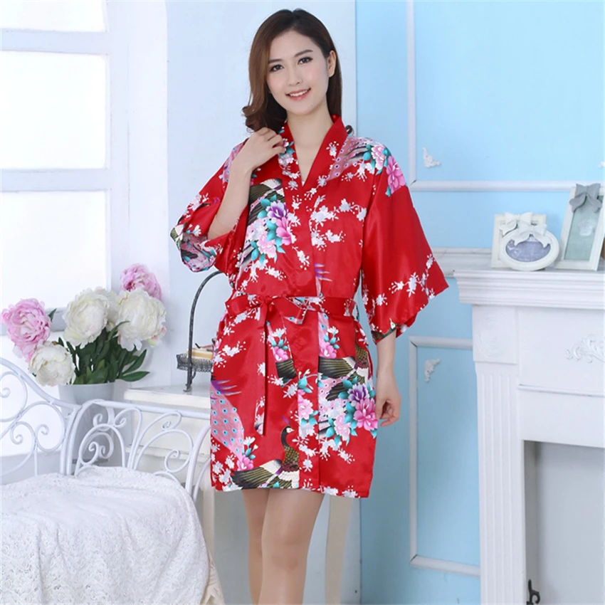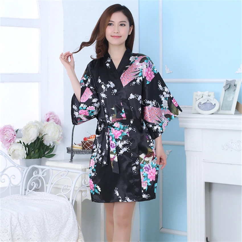 Шелковый Атласный халат для невесты, традиционный японский халат подружки невесты с павлином, женская одежда для сна, юката, кимоно, короткое платье, ночная рубашка