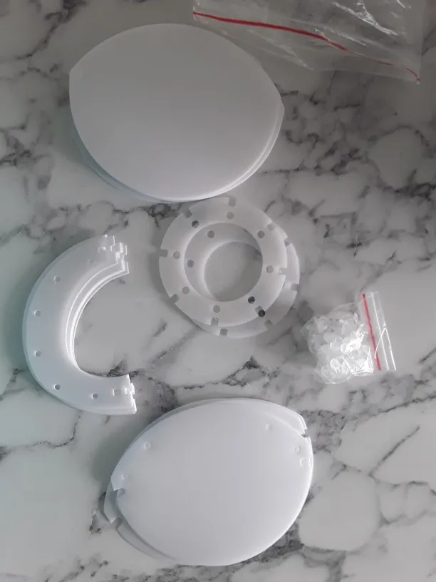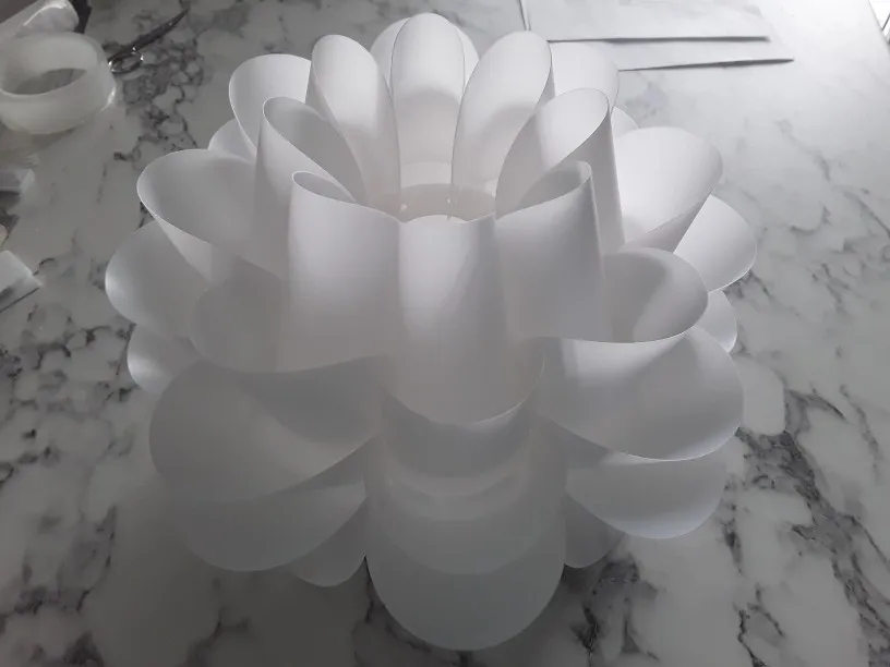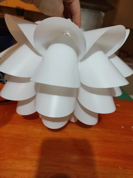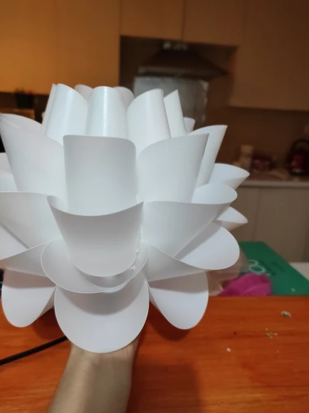 Продавец сразу же отправил товар, доставка очень быстрая Новой почтой несколько недель, упаковано просто в пакете, но ничего не повреждено. В комплекте ровно необходимое количество лепестков и креплений , дополнительные остались только защёлки. Как собирать можно найти на ютубе, единственная сложность, желательно сразу делать всё правильно, отщёлкивая и прикрепляя снова, можно разорвать достаточно тонкий пластик. Ну и главое, выглядит отлично, осталось понять, как туда вставить патрон с лампой.