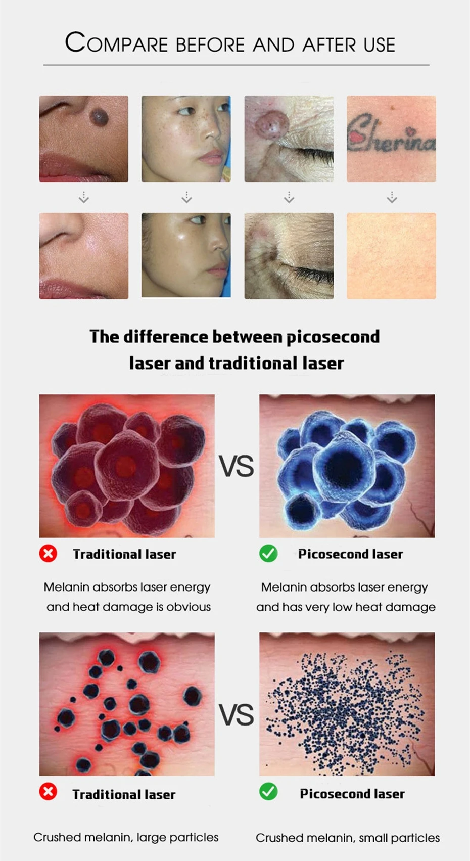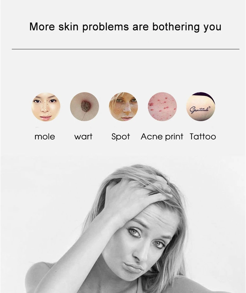 1. Удаление Татуировок (черная татуировка, цветная татуировка. Примечание: цвет должен быть глубоким, небольшой цвет не может быть удален)2. Удаление крота3. Темное пятно/Веснушка/удаление пигмента4. Чистка макияжа бровей5. Лечение акне
