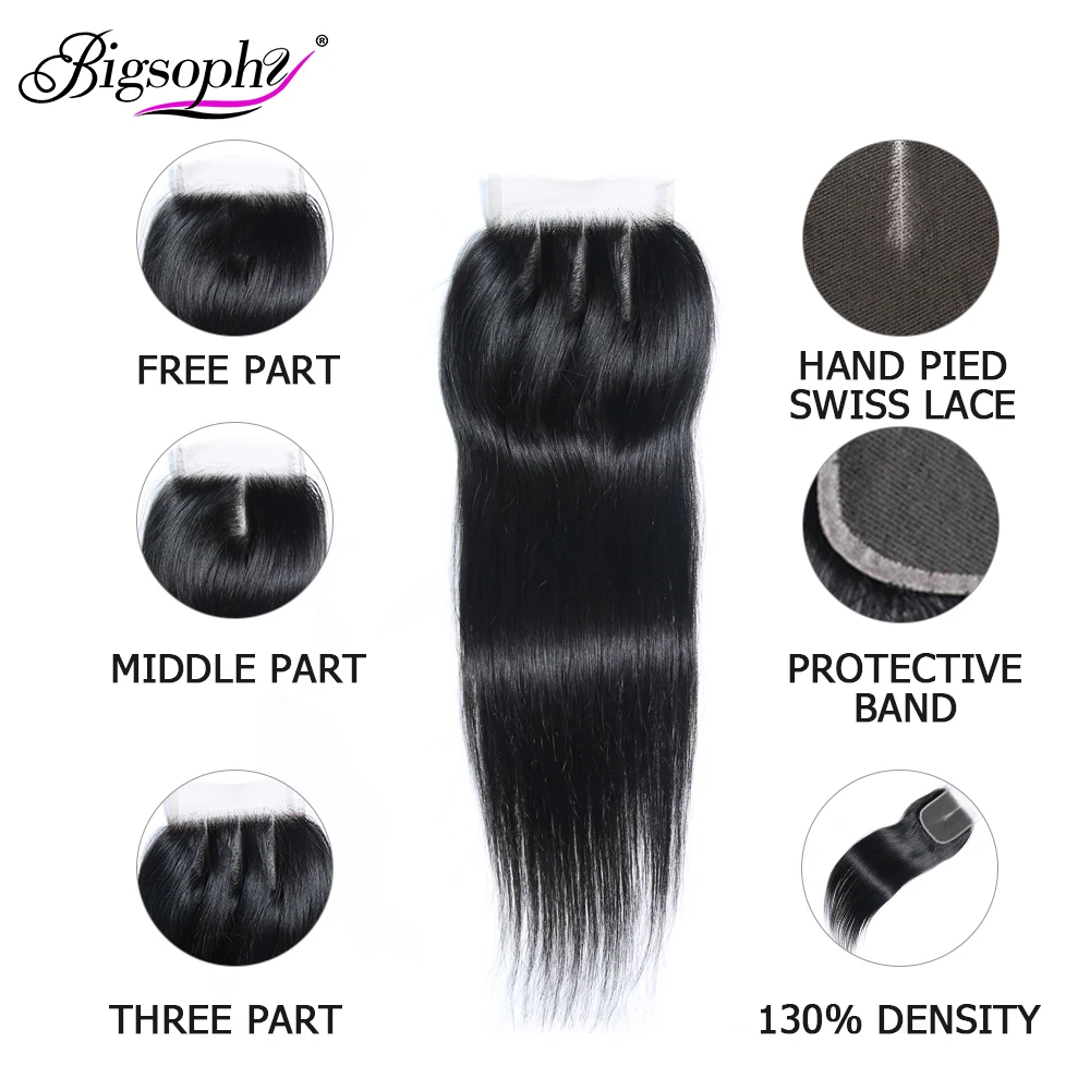 Бигсофи бразильские прямые волосы closure100 % человеческие волосы 8-22 дюйма 4*4 кружевное закрытие Remy волосы плетение швейцарское кружевное фронтальное закрытие