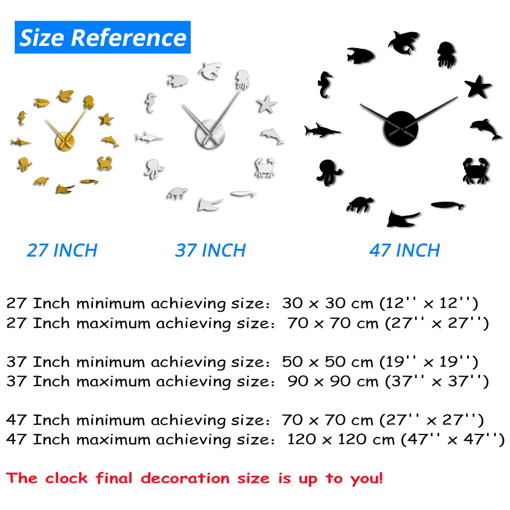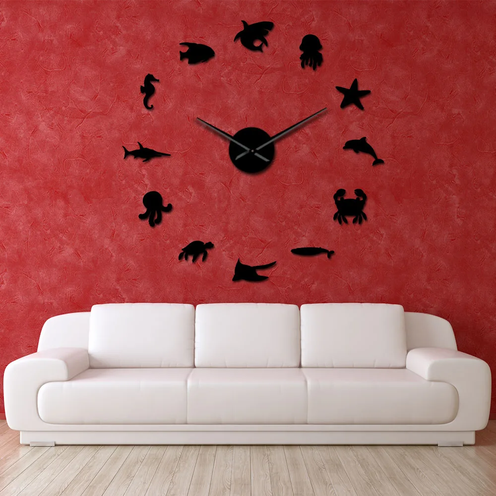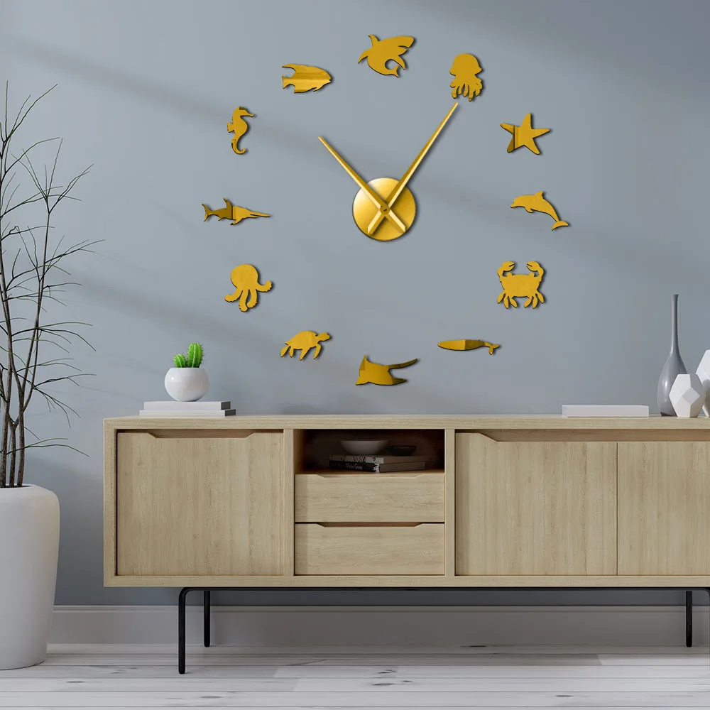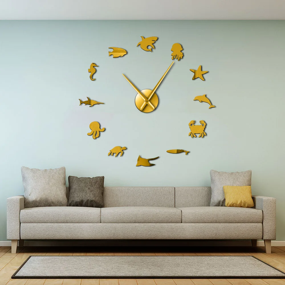 Настенные часы с зеркальными наклейками в виде водных животных, гигантские настенные часы сделай сам для подводной комнаты, детской комнаты, украшение на стену, без рамки