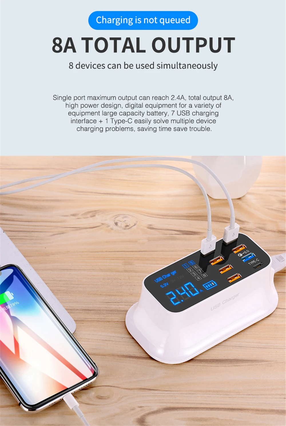 84-Port LED Display USB Charger Quick Charge PD USBC Charger For iPhone 13 12 Pro Tablet Fast Charger For Xiaomi Huawei Samsung