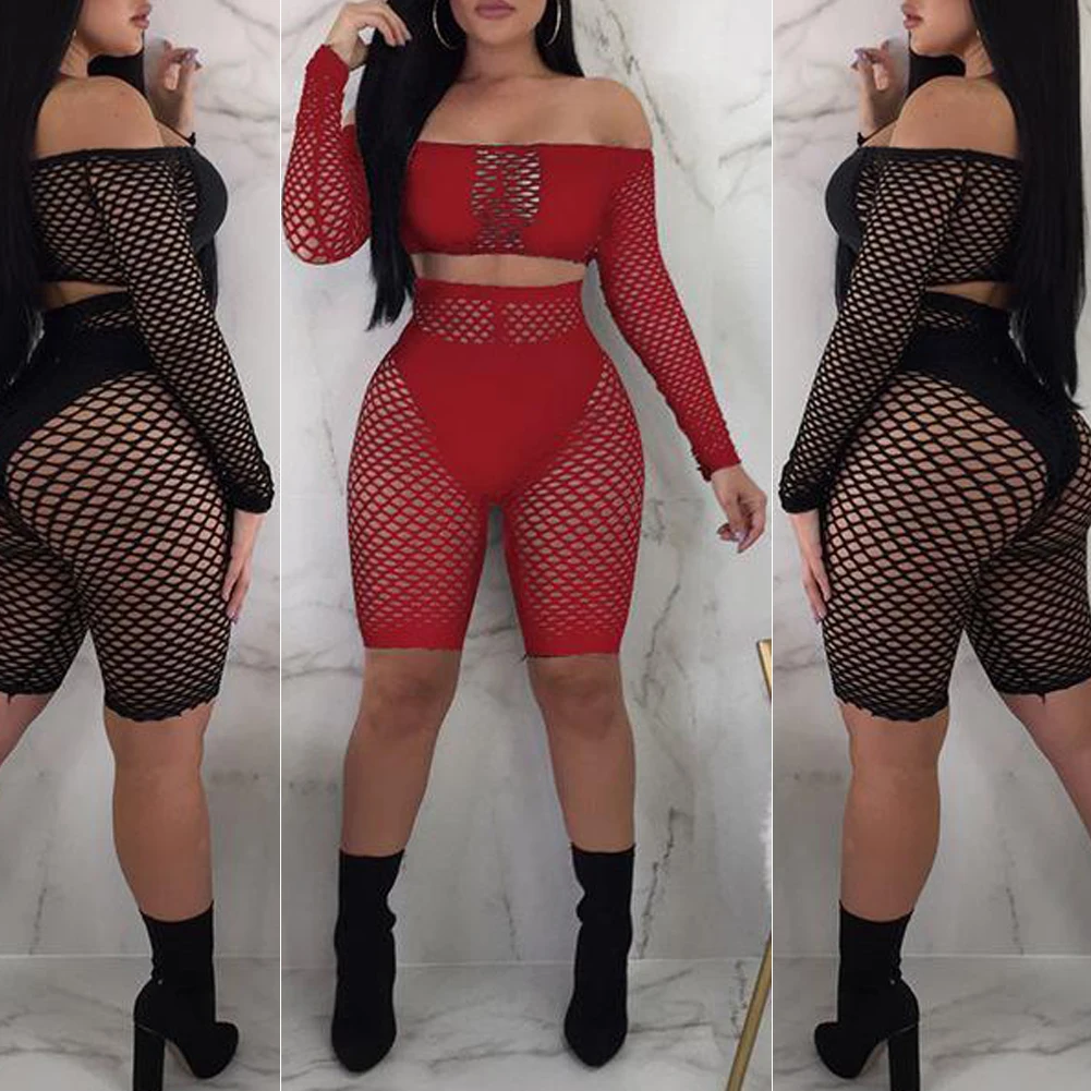 Лидер продаж 2019, Модный женский вязаный крючком сетчатый с длинным рукавом, прозрачный сетчатый укороченный топ, сексуальные шорты, комплект одежды