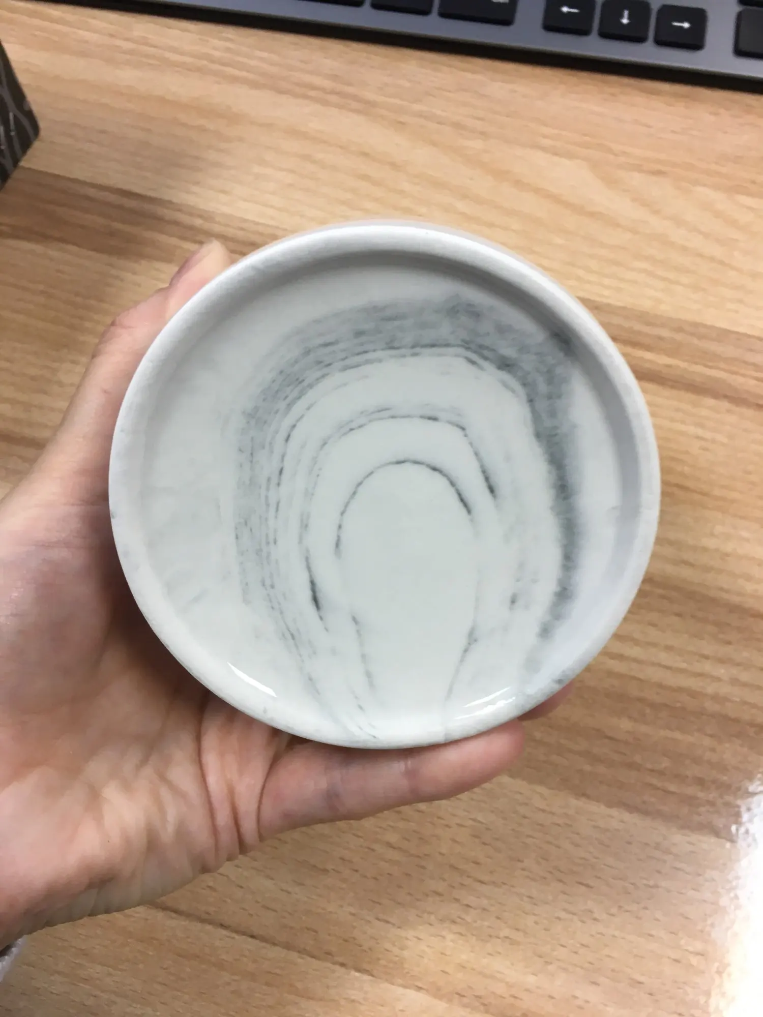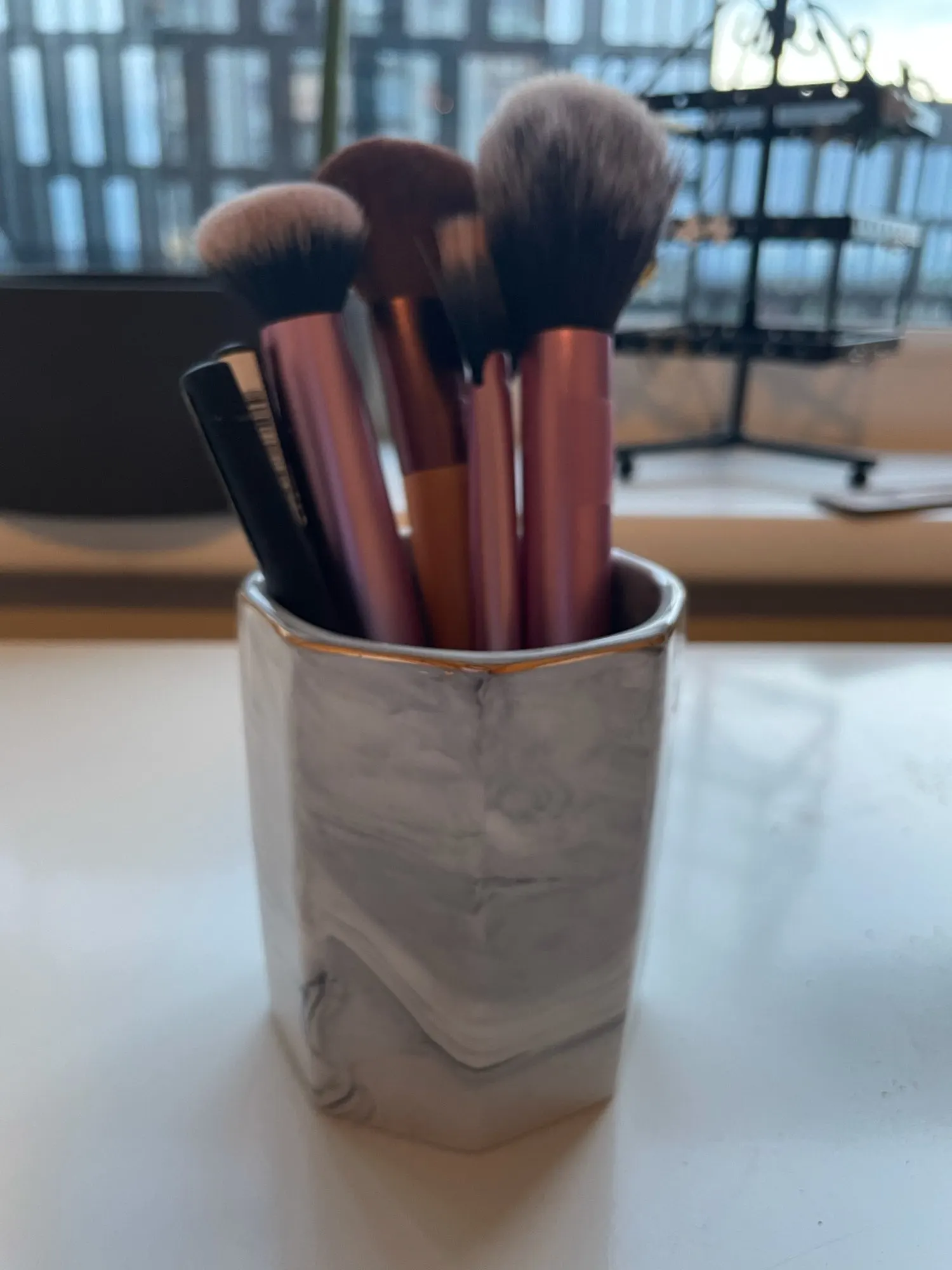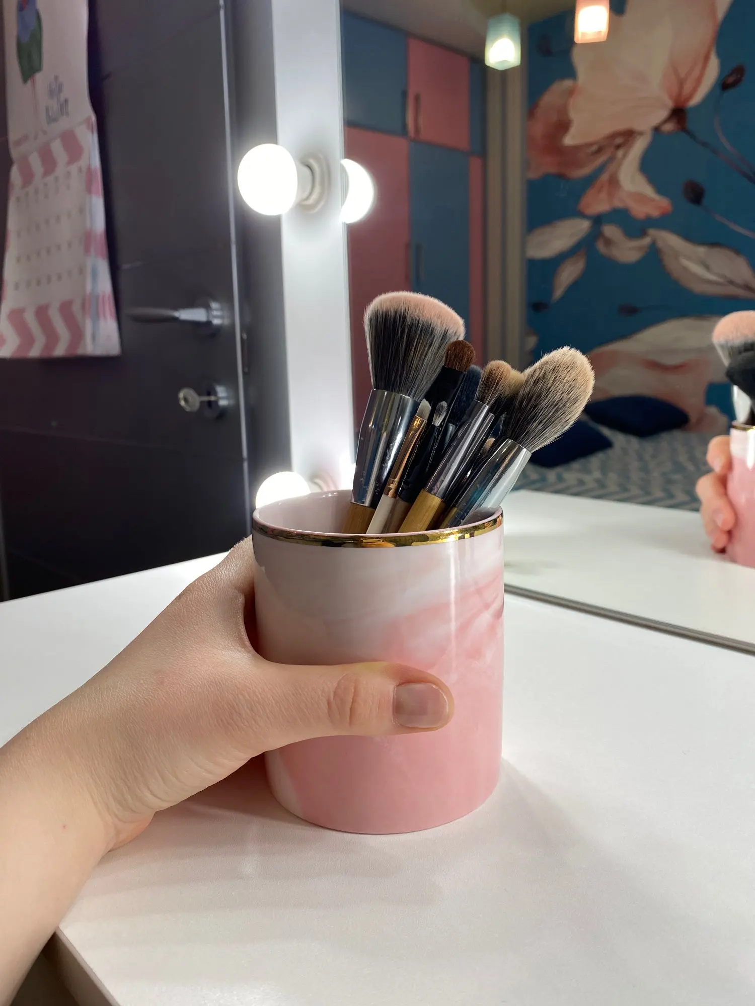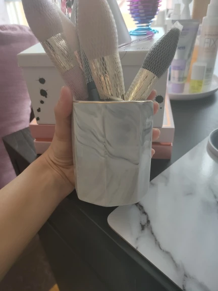 Приехала подставка в хорошо упакованном виде.Без повреждений.Мраморная с серыми прожилками.Позволяет хранить кисти в вертикальном положении.Внутри выглядит также прекрасно, как и снаружи.В общем, горячо рекомендую тем, кто ищет качественную подставку под мрамор.Качество на высоте.